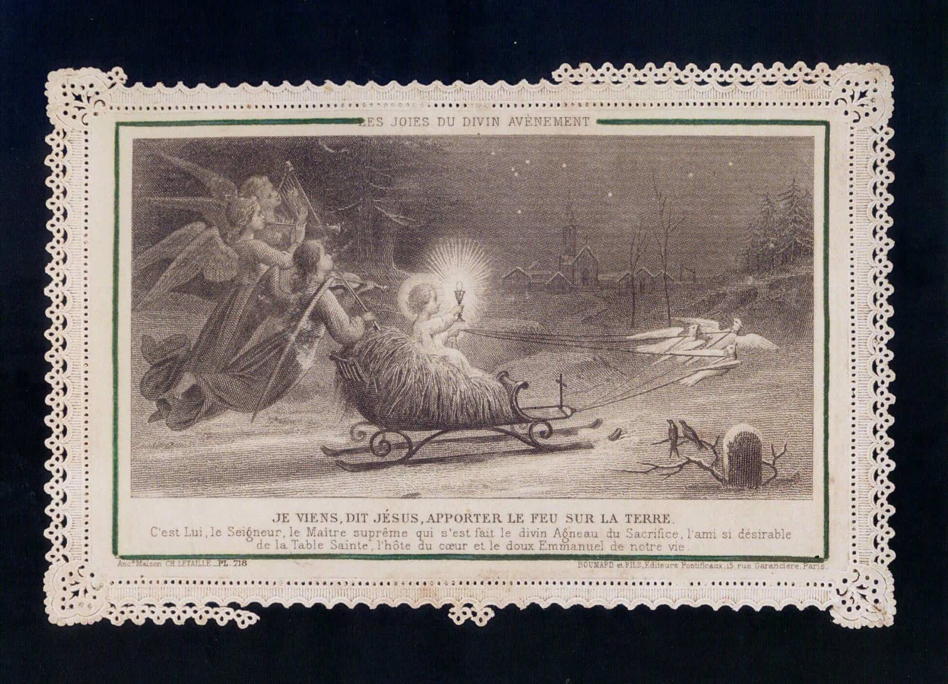 Un autentico capolavoro viene da Parigi: “Je viens, dit Jèsus, apporter le feu sur la terre”, seconda metà del XIX secolo, siderografia con margini trinati a punzone.