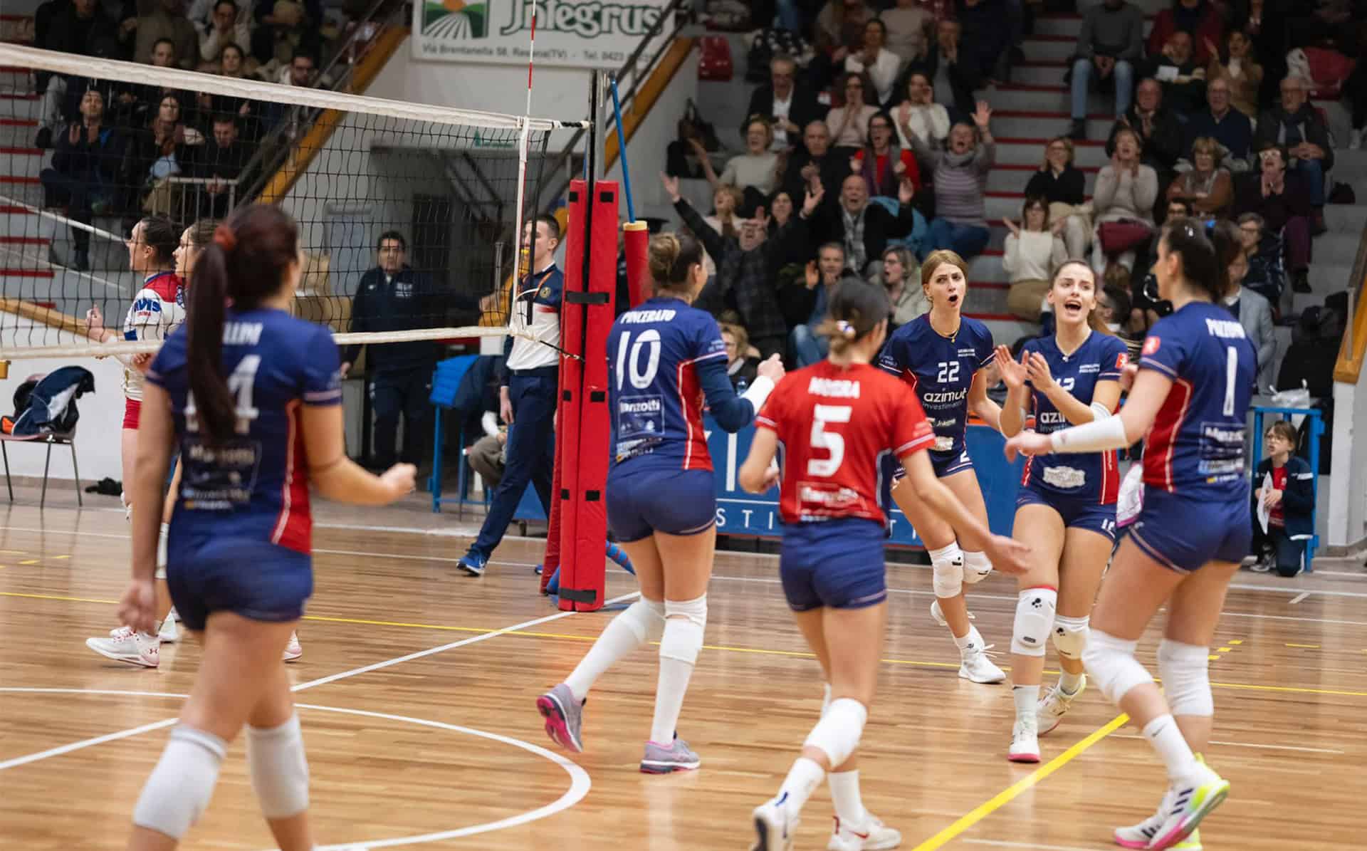 Già alle 17.30 per il fischio d’inizio, i posti a sedere risultavano esauriti. E allora in piedi o sulle scale, in più di 800 hanno accompagnato l’Azimut al 3-1 finale che, con una giornata d’anticipo, conferisce alla squadra di Castelfranco il titolo di campione d’inverno in serie B1, traguardo mai raggiunto dalla società fondata da Anna Toniato nel 1969. La classifica del girone B, in attesa dell’ultima d’andata, vede l’Azimut Giorgione al comando con quattro lunghezze di vantaggio sulla seconda Fantini-Folcieri.