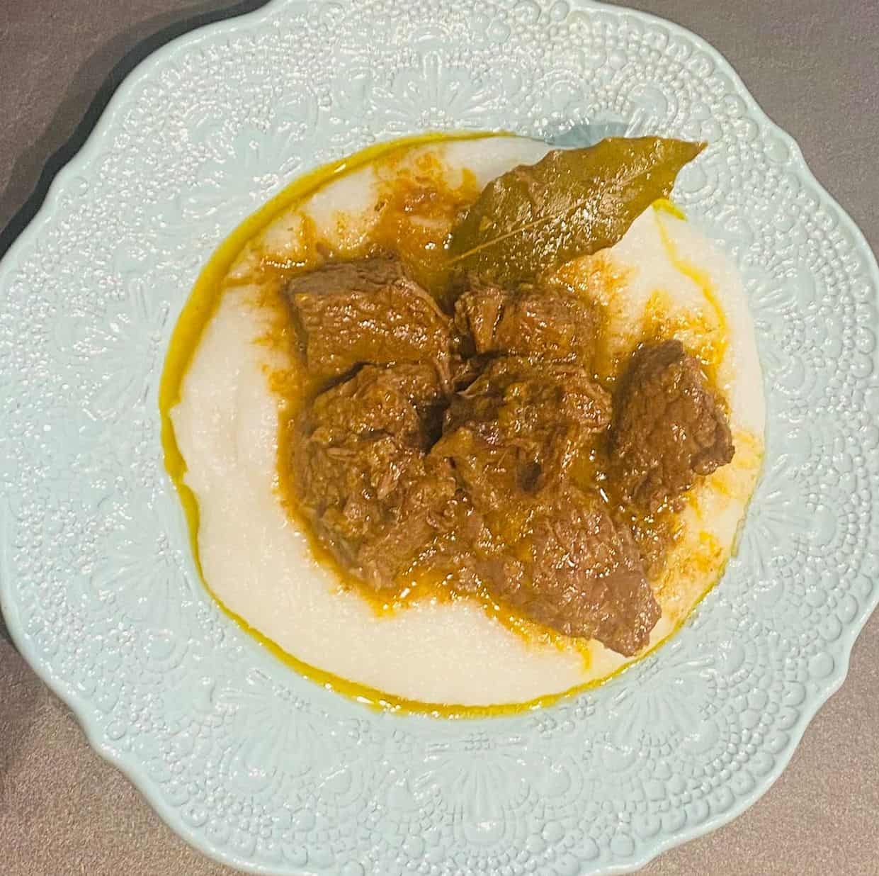Impiattiamo preparando il letto di polenta con sopra lo spezzatino.