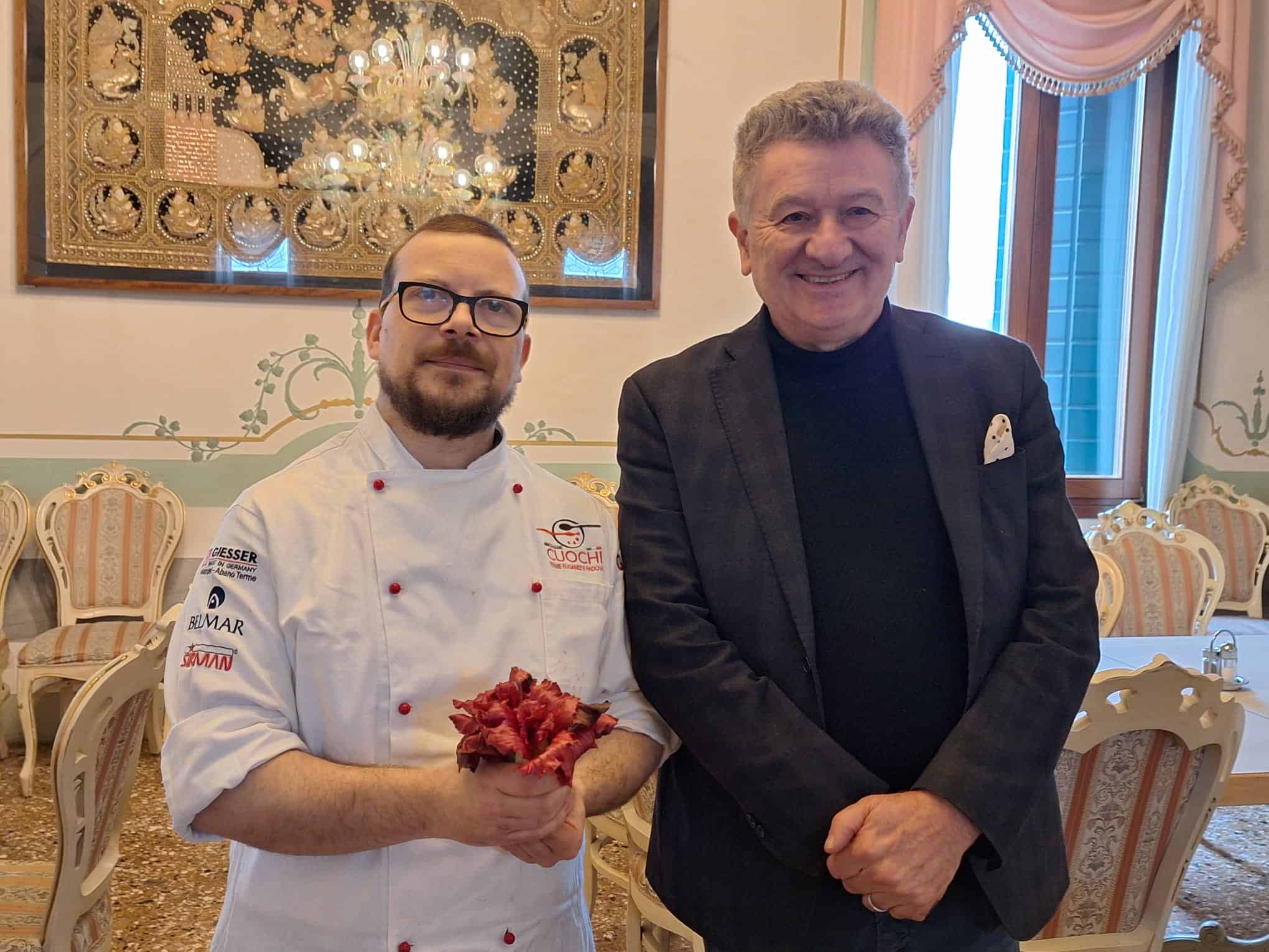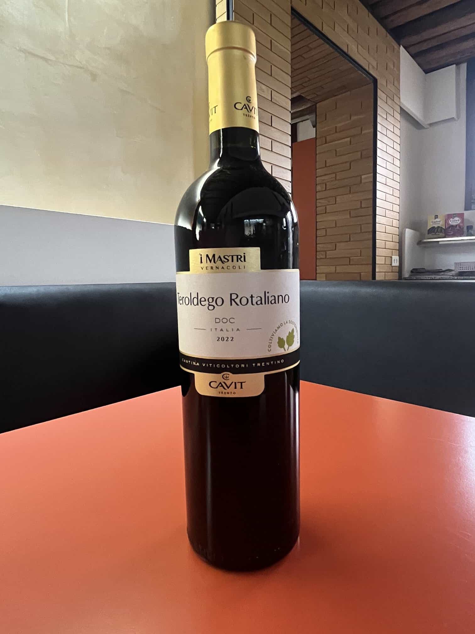 Abbiamo effettuato l’abbinamento a queste tagliatelle con la Rosa di Gorizia con un buon Teroldego Rotaliano DOC della cantina Cavit di Trento. Lo propone il direttore di sala del ristorante Villa Contarini Elio Nagy. E’ un vino deciso, sapido e di elegante equilibrio derivante dall’omonimo vitigno coltivato nella piana Rotaliana. Un rosso di 12,5 gradi, gradevole e bene abbinato a questo piatto.