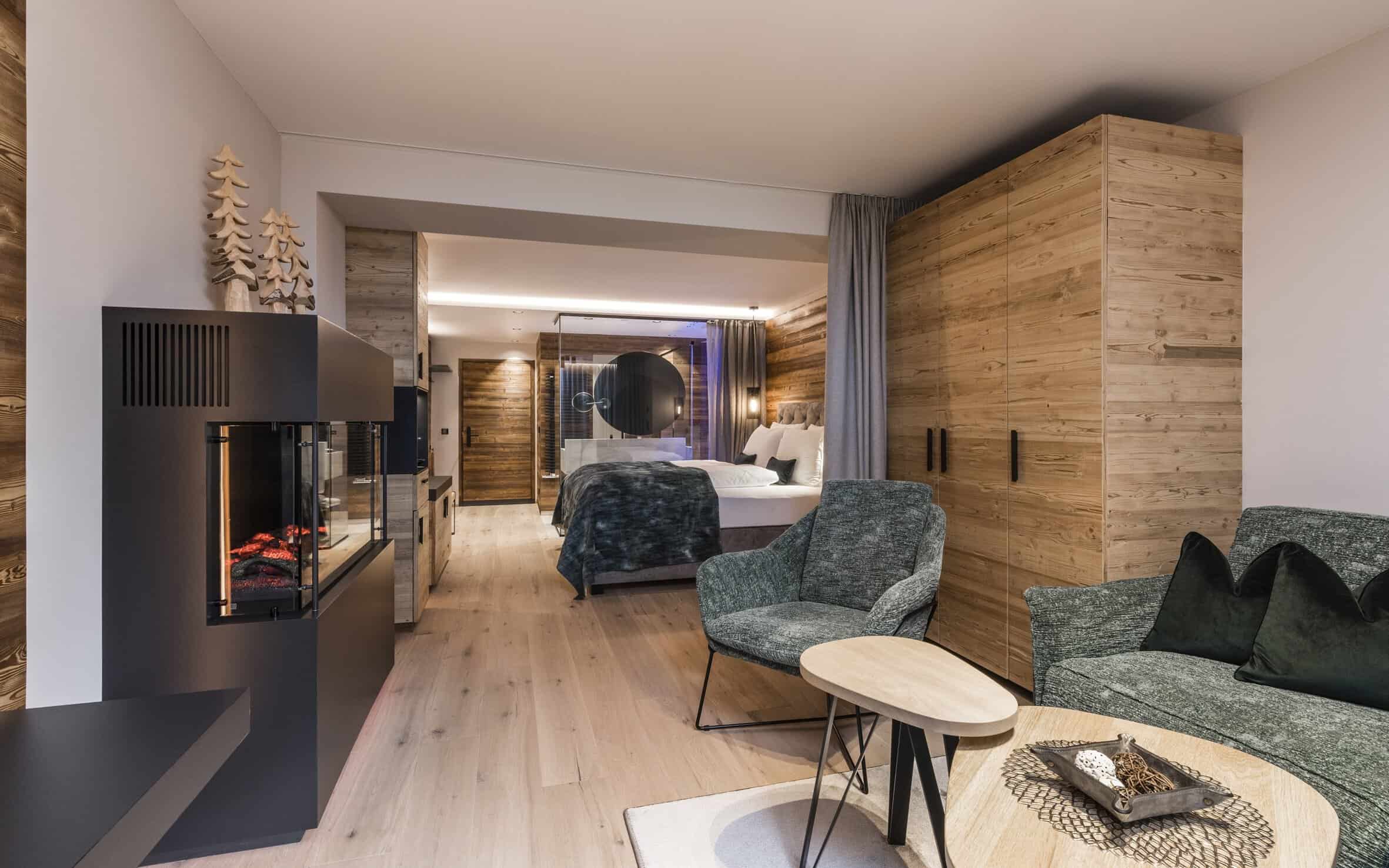 La coppia può scegliere la romantica Junior SuiteTre Cime Style, che coccola gli innamorati con il suggestivo caminetto The Flame, balcone e pavimento in legno. A caratterizzare la camera un lifestyle alpino, con letto king-size e divano nella zona soggiorno, bagno open space con doccia a pioggia e naturalmente Flat-TV, minibar, macchina da caffè e angolo del tè.
