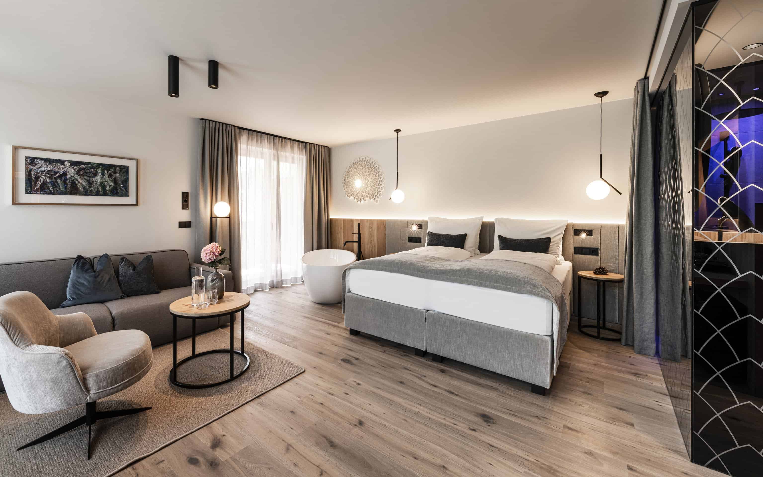 La Bad Moos Spa Suite è una soluzione esclusiva, per famiglia ma anche per la coppia, dal momento che ha al suo interno una Private Spa. A completare l’offerta caminetto The Flame, camera matrimoniale con letto king-size, angolo soggiorno separato con divano-letto, 2 bagni con doccia a pioggia, 2 Flat-TV, macchina da caffè e angolo del tè, minibar.