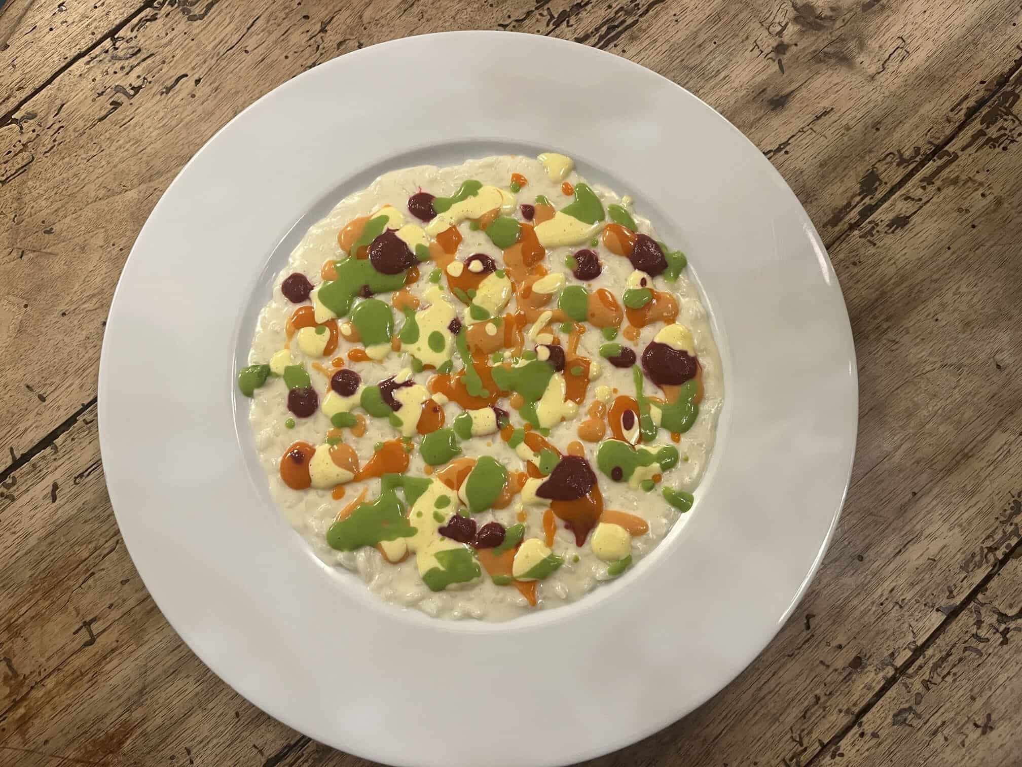Ingredienti: 80 g di riso carnaroli, 20 g di burro di malga, 30 g di parmigiano reggiano “Vacche Rosse”, q.b. aceto di mele, q.b. succo limone non trattato, 140 g di acqua, 110 g di acqua marina, salsa di acetosella, salsa di broccolo fiolaro, salsa di rapa rossa, salsa di pomodoro del Cavallino, salsa di peperone crusco.
