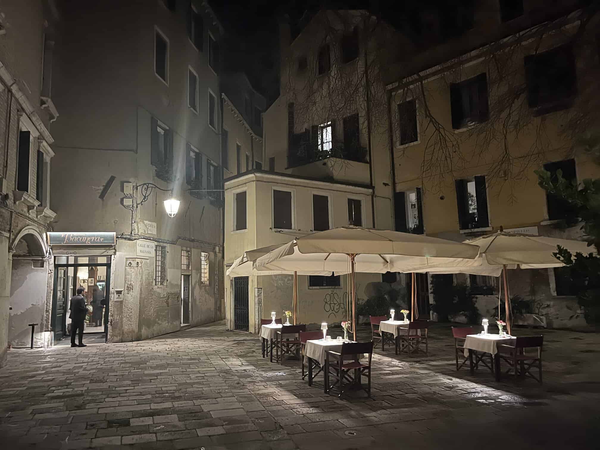 C’è una Venezia insolita, segreta e affascinante. Basta allontanarsi di poco dal percorso turistico per entrare in qualche campiello e scoprire l’autenticità di questa città, quella da “gustare” con i ritmi lenti. Nelle vicinanze di Rialto ci dirigiamo verso la Chiesa dei Santi Apostoli. Percorriamo la calle dietro la chiesa e ci troviamo fra il Soportego de La Cason e Calle della Malvasia sino a entrare nel Campiello de la Cason. Notiamo l’Hostaria Bacanera, piccolo gioiello nascosto in un campiello non conosciuto, affascinante e misterioso. L’Hostaria Bacanera è quella che aveva notato il noto imprenditore gourmand milanese Marcello Forti che da tempo cercava di acquisire un ristorante a Venezia. Poi, una sera, inoltrandosi nelle calli, si è imbattuto in questo luogo. “E’ stato un amore a prima vista”, ha dichiarato. Lo scorso anno la aprì al pubblico. Si chiama “Bacanera”, riferimento alle bacche nere che produce l’albero Bagolaro che si trova nel campo. Durante la bella stagione viene allestito il romantico dehors del ristorante. Nell’Hostaria Bacanera ci accoglie simpaticamente lo chef Alessio Cascino. Il clima è quello di un piccolo ristorante dove si sta bene (e si mangia bene). Il locale è pieno, c’è la musica di Alberto Vianello al sax e di Stefano Ottogalli alla chitarra.