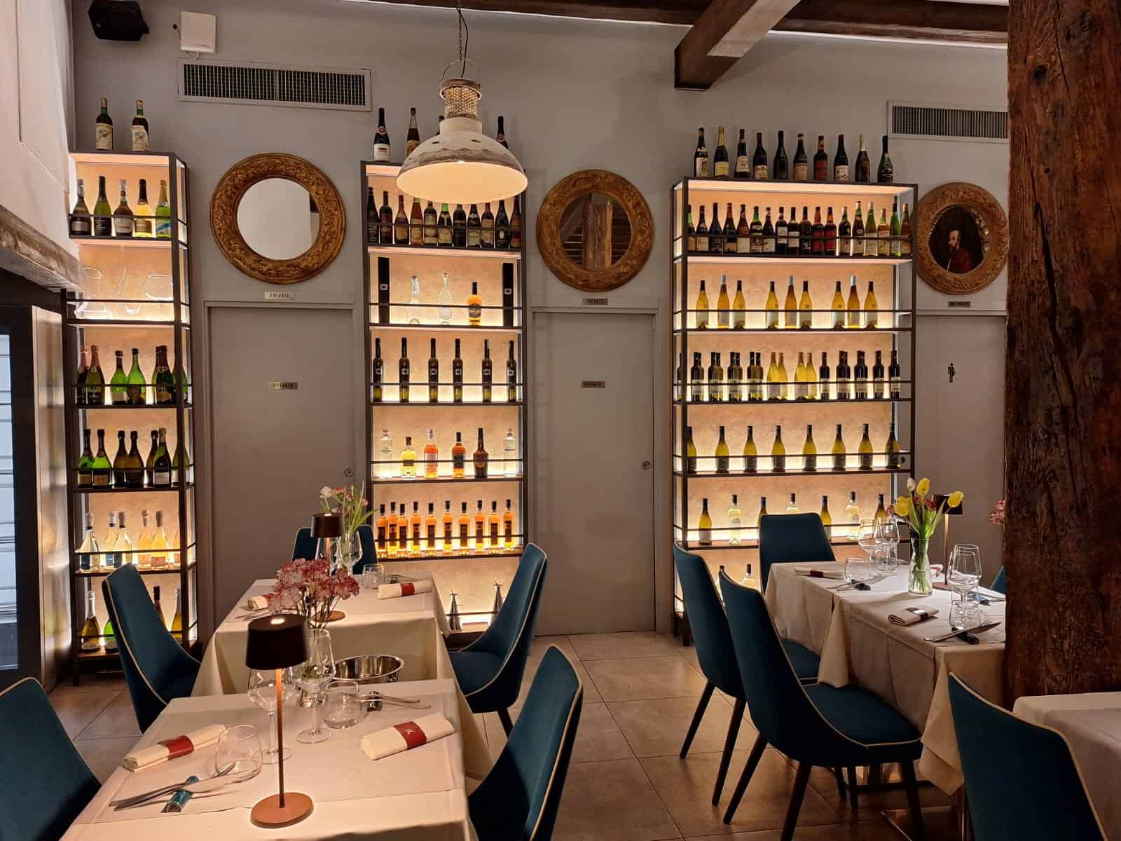 Il direttore di sala (e sommelier) è Valentino Hoxhaj. E’ lui che ci spiega i due grandi ritratti della scuola del Tintoretto del Cinquecento e Seicento, posti nella sala. Raffigurano i Procuratori di San Marco, la carica più importante dopo il doge durante la Repubblica Serenissima. Ci fa vedere una colonna a fianco della cucina. “La vede? Pare che questa colonna sia una delle più antiche di Venezia, risalente al XIV secolo e proveniente dall’antica Costantinopoli”. E di sorprese piacevoli in questo locale ce ne sono ancora…