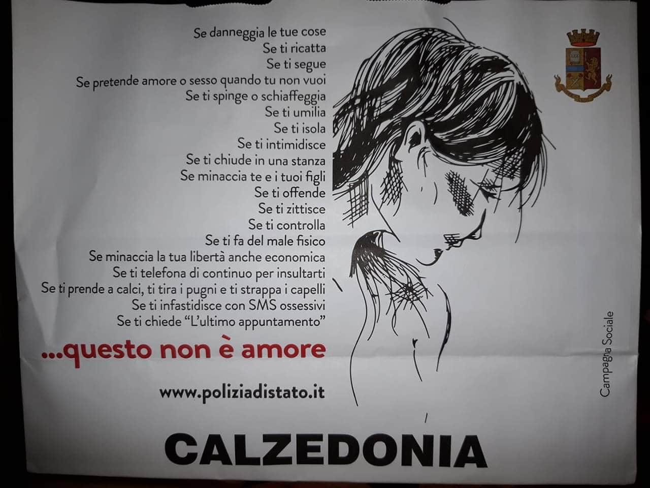 Sulle sportine di Calzedonia il memento comincia così: “Se danneggia le tue cose, se ti segue e ti ricatta e pretende amore o sesso quando tu non vuoi…, Se ti zittisce, se ti controlla…, Se ti fa del male fisico e minaccia la tua libertà anche economica…, Se ti telefona di continuo per insultarti…, Se ti prende a calci e ti tira i pugni e ti strappa i capelli…, Se ti chiede l’ultimo appuntamento… QUESTO NON È AMORE”. Firmato da Giulia Bertagnolio per la campagna sociale della Polizia di Stato contro il femminicidio.