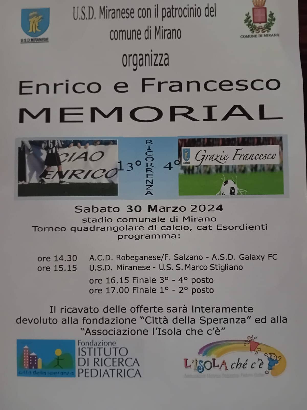 L’evento è reso possibile grazie alla dirigenza del Usd Miranese e ai genitori dei due giovani calciatori che militavano nelle file di questa società. Enrico venne a mancare nel 2008 all’età di 12 anni, mentre Francesco nel 2018, all’età di 16 anni, entrambi a causa di due diverse forme tumorali. Questo appuntamento di sport e solidarietà vuole ricordare questi due ragazzi cresciuti con la grande passione per il gioco del calcio.