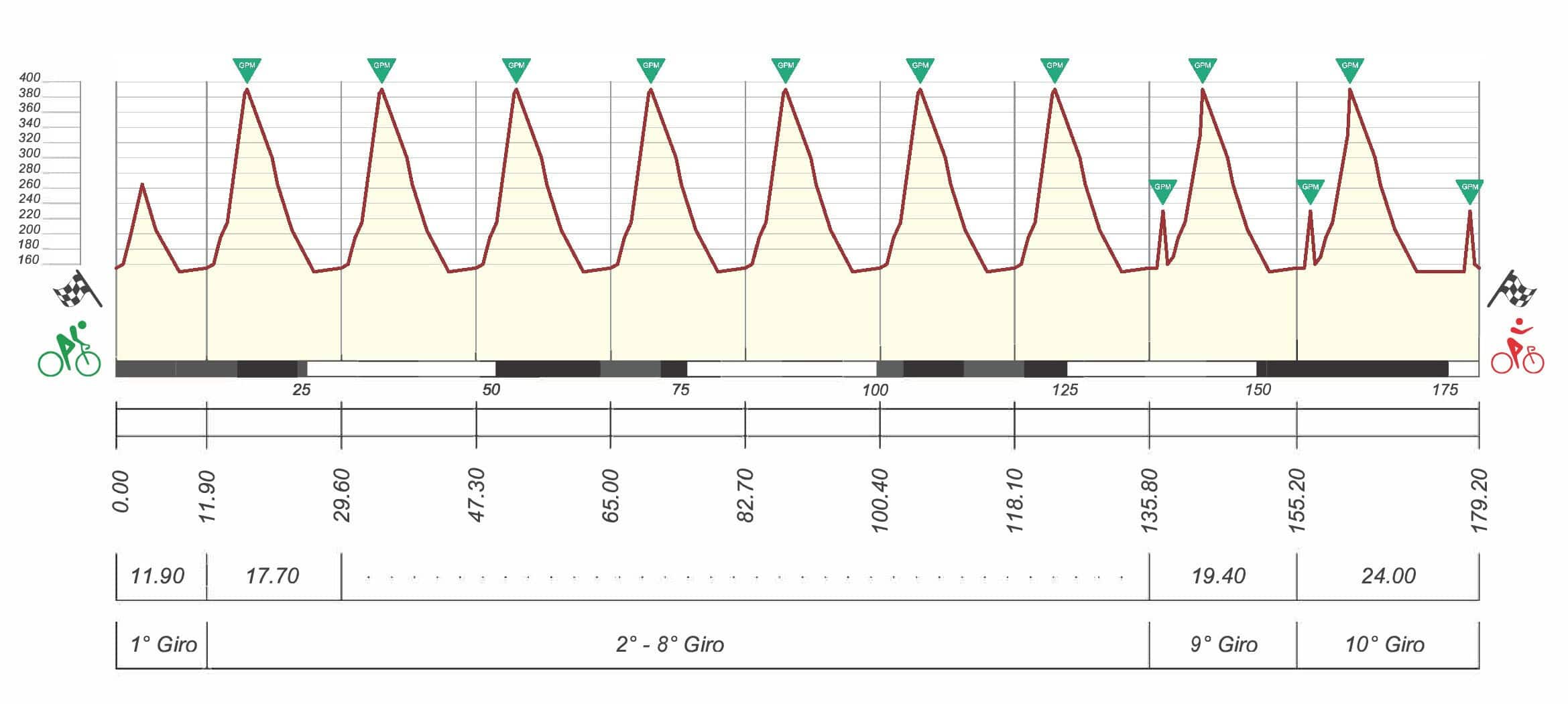 Dopo gli 8 giri sul tradizionale circuito iniziale delle Conche, gli atleti affronteranno ben 5 passaggi, due in più rispetto all’anno passato, sull’anello del “Giro del Buongustare”, inaugurato nel 2023 e caratterizzato dallo strappo di Piai della Vigna (500 metri al 9% con una punta al 15%). Anche nel 2024, il circuito intermedio del Giro del Belvedere prevede un percorso enogastronomico aperto al pubblico, destinato ad esaltare le specialità del territorio. Tuttavia, rispetto all’edizione passata, lo strappo di Piai della Vigna verrà affrontato anche nel duplice passaggio sul circuito finale.