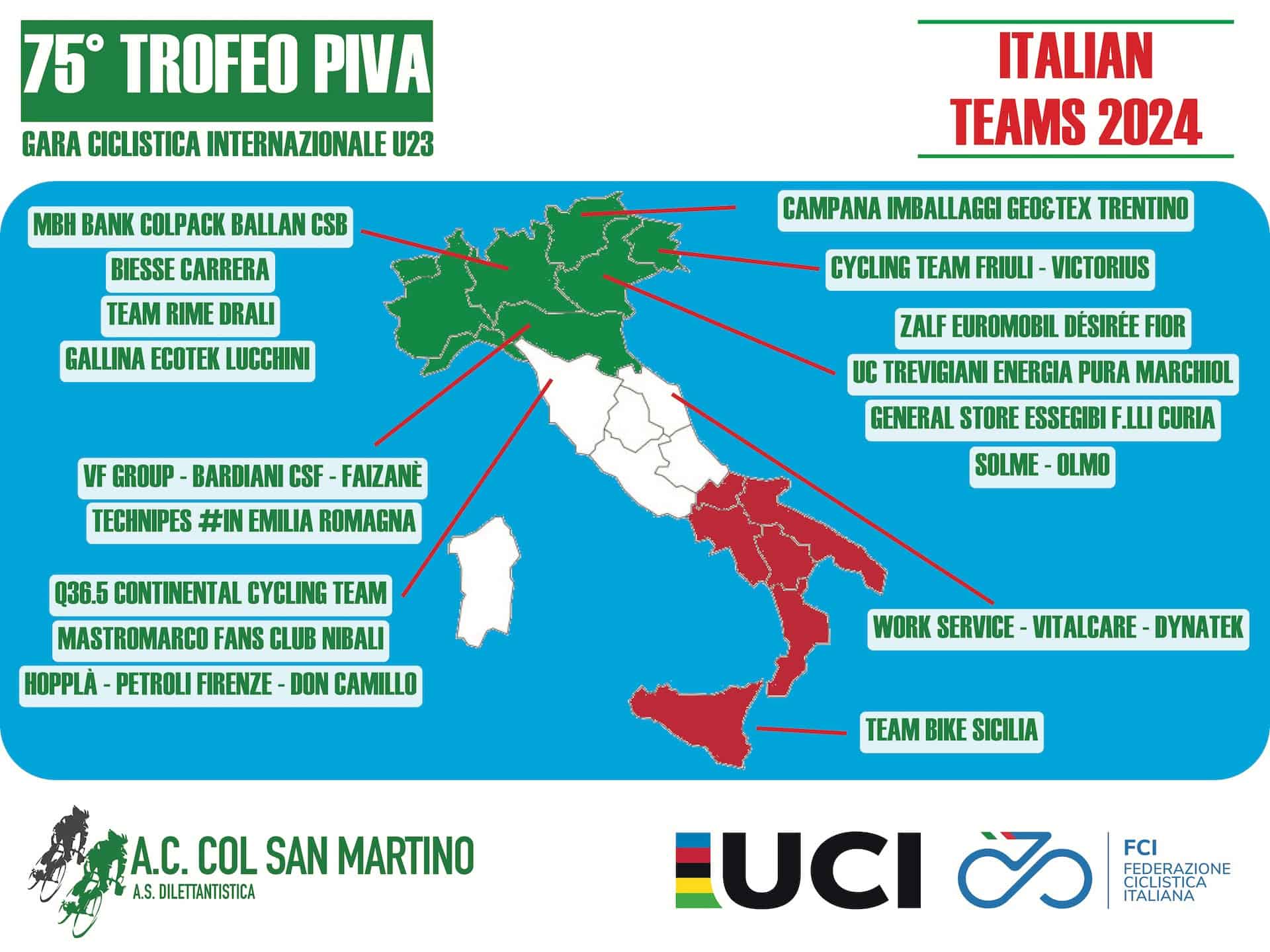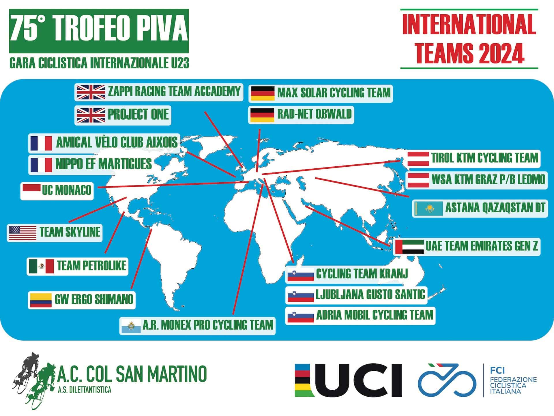 Quest’anno più che mai, inoltre, il Trofeo Piva avrà tinte latino-americane, vista la presenza della colombiana GW Ergo Shimano e della messicana Team Petrolike, gestita dal grande Gianni Savio, senza dimenticare la A.R. Monex – l’anno scorso ha lanciato il talentuosissimo Isaac Del Toro (vincitore dell’Avenir e ora in UAE) – che ha licenza sanmarinese ma ha una forte anima messicana. “Con un calendario internazionale sempre più denso di appuntamenti, non è certo facile riuscire a ritagliarsi il proprio spazio e attrarre le migliori squadre di categoria – spiega il Presidente dell’AC Col San Martino, Mario De Rosso -. Anche per il 2024, però, siamo riusciti ad allestire un parterre di assoluto livello, che vedrà tanti talenti darsi battaglia sulle nostre belle strade. Sono sicuro che anche il vincitore della prossima edizione sarà un ragazzo di cui sentiremo parlare molto nei prossimi anni”.