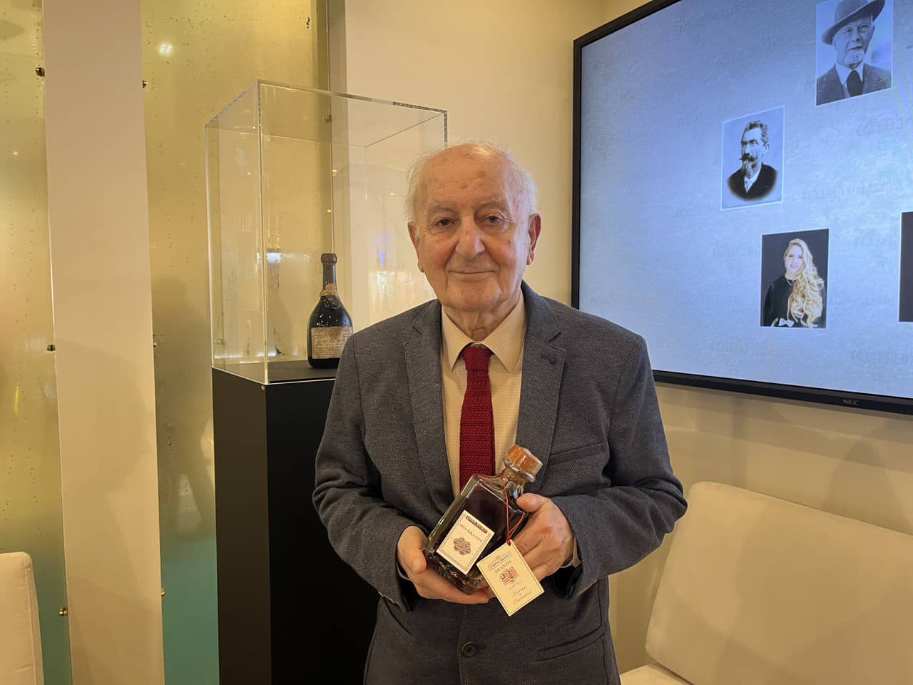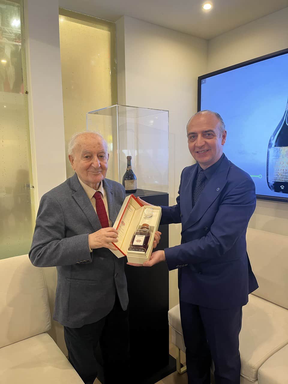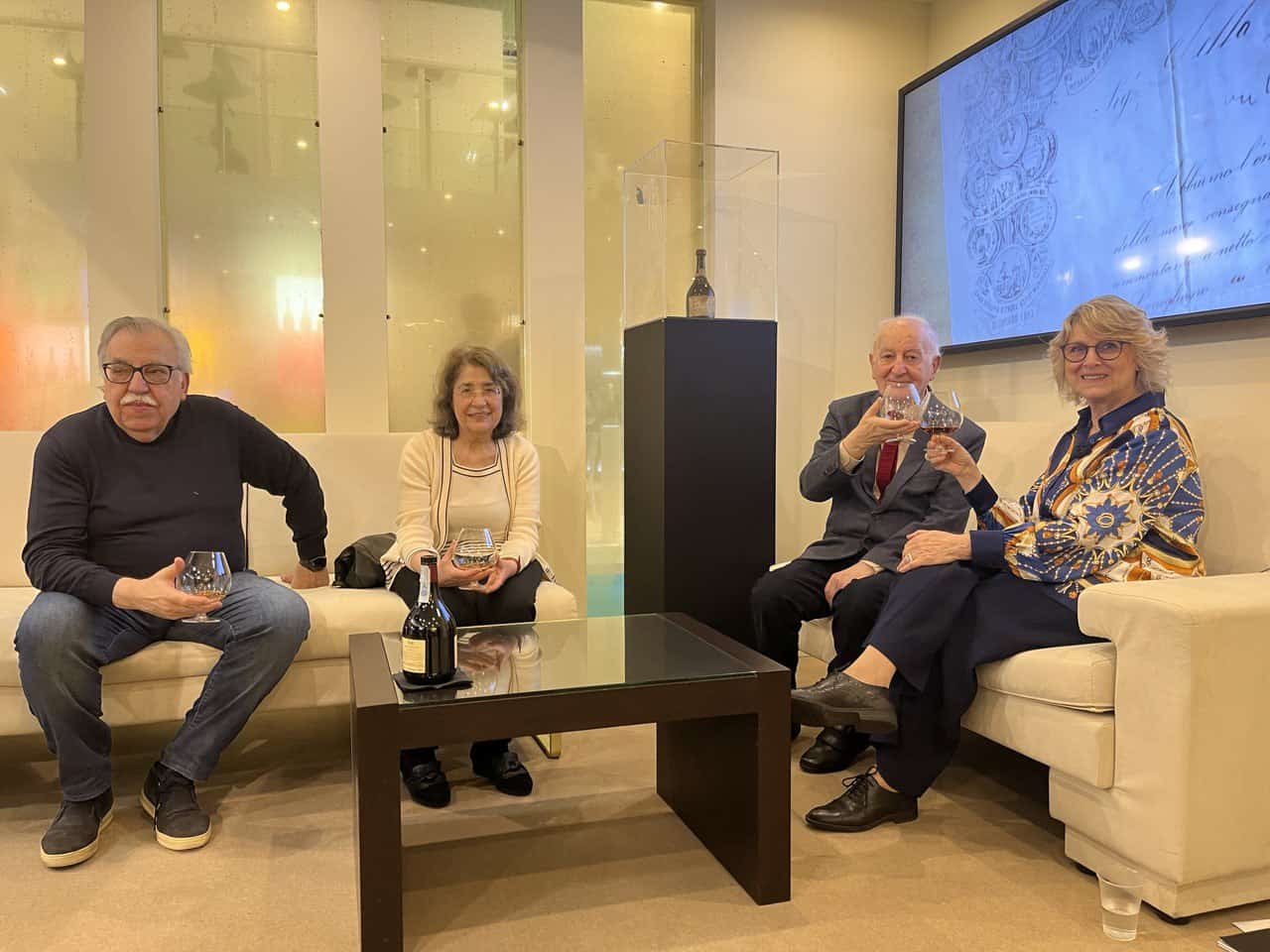 Il nostro collaboratore Carrubba, che è stato capo a lungo del tg veneto della Rai e vicedirettore Rai, ha ricordato con brio quegli anni e il senso di quella bottiglia per la sua famiglia. Scimone gli ha fatto omaggio di una bottiglia storica di brandy realizzata artisticamente sul modello di quelle in commercio più di ottant’anni fa.