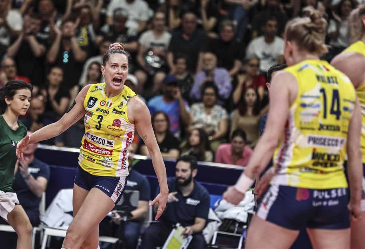 Premio di MVP, ad una settimana dal medesimo titolo nella Finale Scudetto, ad una Isabelle Haak da 23 punti, ma a meritare menzione è anche Kathryn Plummer, che ne mette a segno 21 risultando determinante soprattutto nelle frazioni finali insieme alla connazionale Cook (10) e a Fahr (9), in stampelle sia nel pre che nel post partita per una distorsione alla caviglia ma autrice di una stoica prestazione. A festeggiare anche Robin De Kruijf, definitivamente incoronata regina in terra turca: 6 punti nella partita d’addio che le hanno permesso di diventare l’all time scorer di Conegliano con 2.567 palloni messi a terra nei suoi 8 anni vissuti in gialloblu. Per Milano, arrivata con le batterie scariche al tie-break ma assolutamente degna rivale alla sua prima finale di Champions, non bastano i 19 punti di Egonu e i 13 di Sylla.