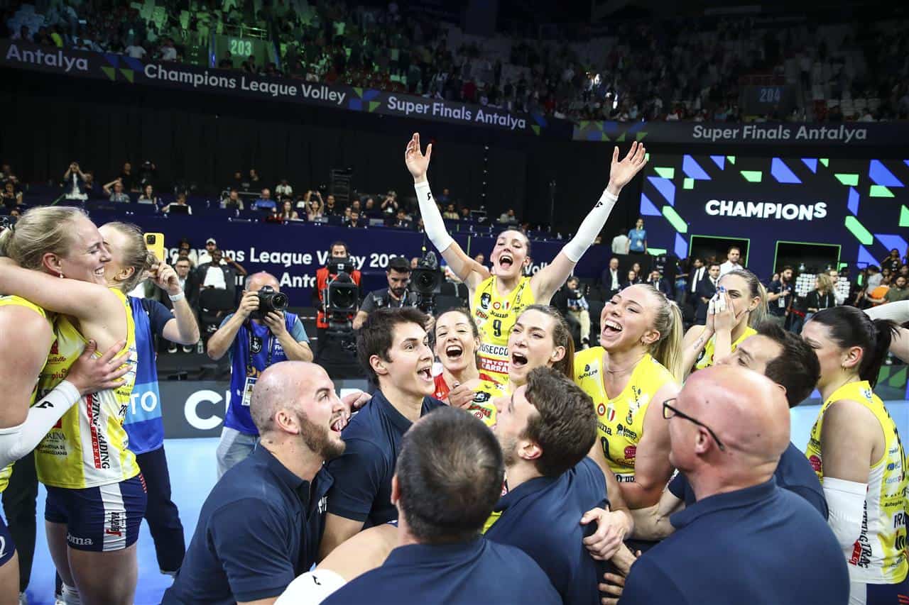 Una CEV Champions League perfetta, con 11 vittorie in altrettante partite, per un Grande Slam da leggenda: l’A.Carraro Imoco Conegliano, dopo aver conquistato ogni trofeo in Italia, alza al cielo la quarta coppa della sua trionfale stagione superando nel derby italiano un’Allianz Vero Volley Milano da applausi al tie-break e laureandosi Campione d’Europa per la seconda volta nella sua storia. Coach Santarelli si conferma Re Mida sotto il cielo d’Antalya, dopo un match in cui le sue ragazze si sono fatte rimontare due volte dalle avversarie guidate da coach Gaspari, prima di gioire nell’ultimo set.