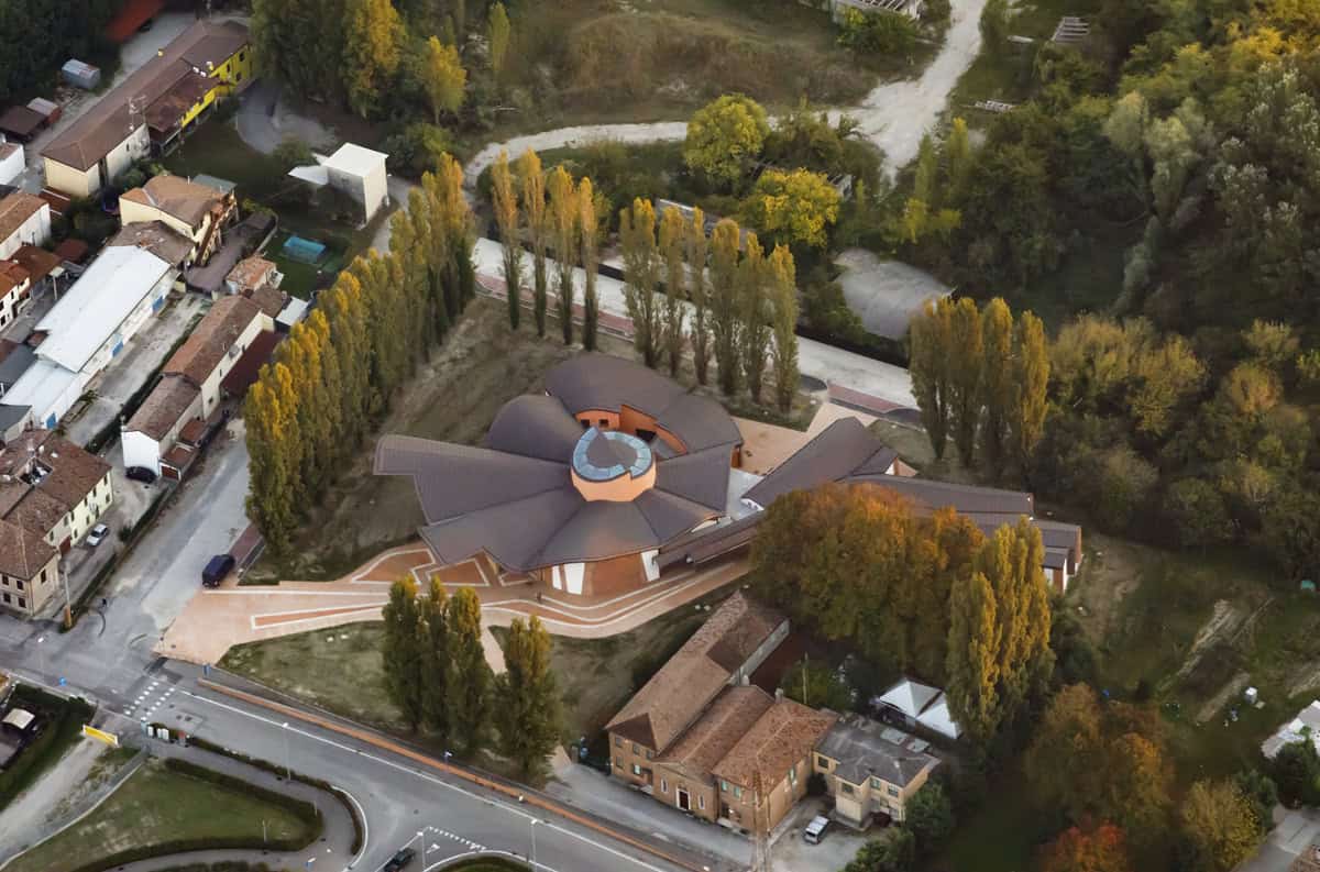 Realizzata prendendo le distanze dall’architettura storica ferrarese, la chiesa disegnata da Tagliabue presenta un’impostazione di matrice organica, tratto distintivo dell’architetta. A caratterizzare il volume principale è la copertura a volta, altro elemento che permette di riconoscere con immediatezza la firma della progettista. La luce naturale che proviene dall’alto, inonda una monumentale croce lignea, realizzata con travi di recupero.