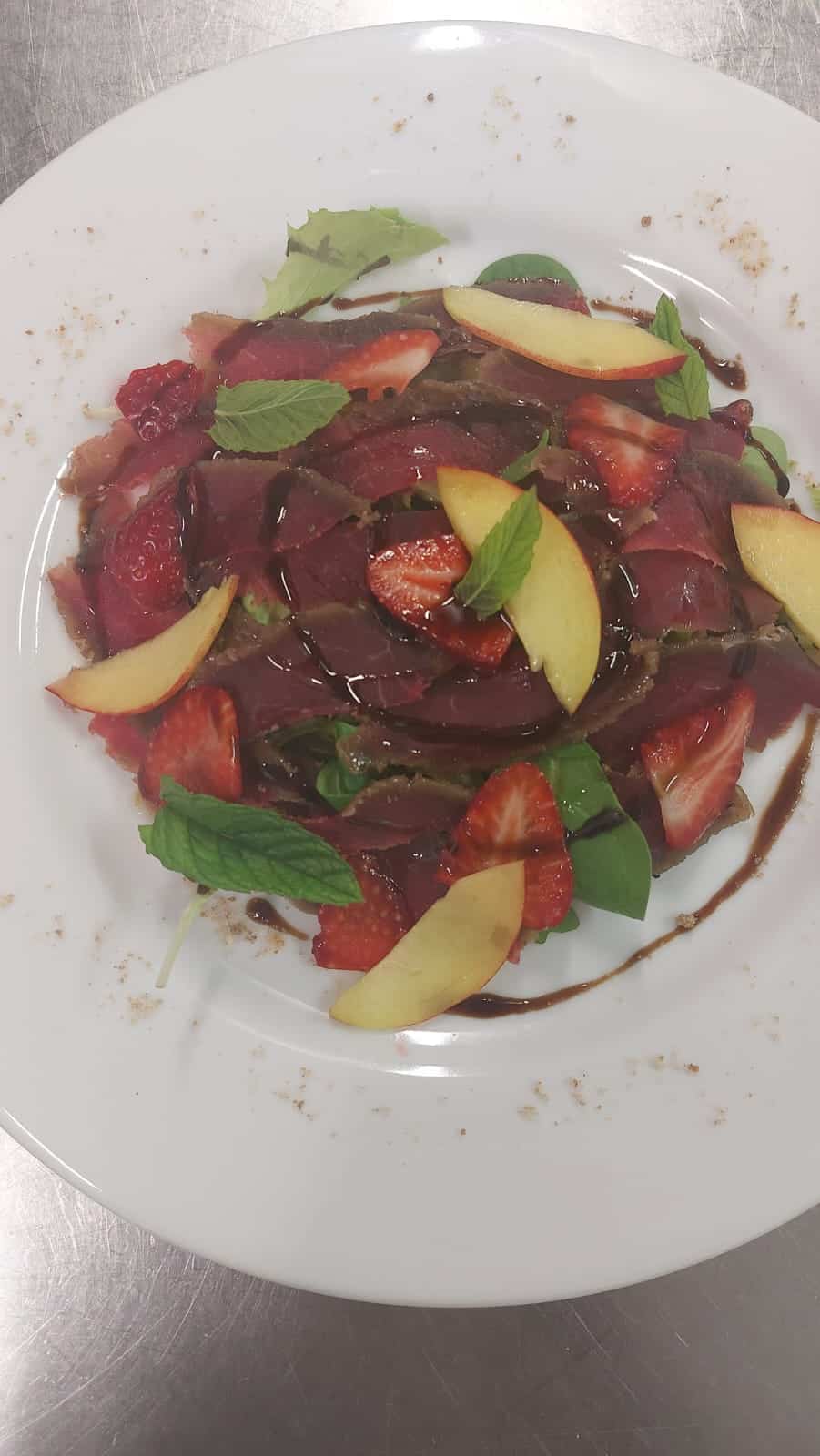 Prepariamo la carne e la aromatizziamo con le varie erbe aromatiche. Massaggiamo la carne, lasciamo riposare e riassaggiamo, questo per una settimana, aggiungendo una mistura di sale e di zucchero. Con un panno procediamo ad asciugare la carne finchè risulta bene asciutta. In un piatto prepariamo la misticanza e alterniamo le fettine di carne che abbiamo precedentemente tagliato. Aggiungiamo delle fettine di fragole e pesche. Ultimiamo il piatto con olio extra vergine di oliva e salsa di aceto balsamico.