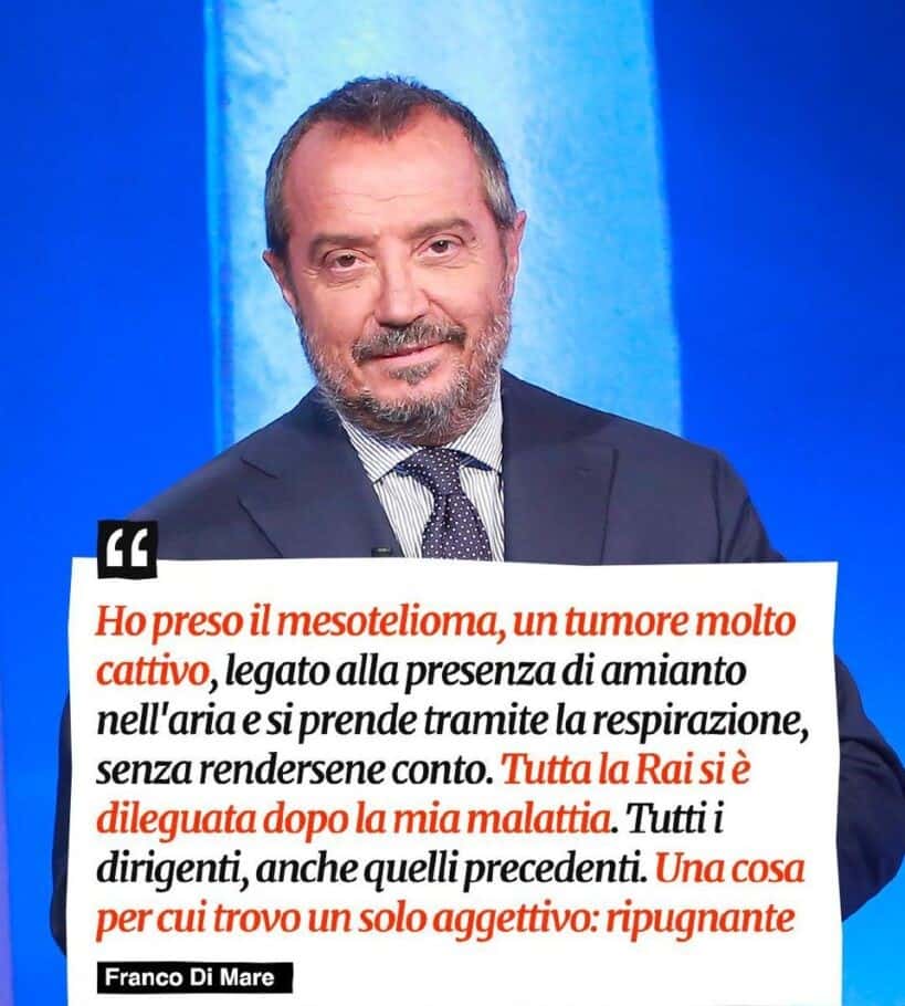 Franco Di Mare è mancato il 17 maggio scorso, due settimane dopo aver denunciato pubblicamente su un canale televisivo, davanti a Fabio Fazio, di aver contratto un tumore legato molto probabilmente all’esposizione all’uranio delle armi in tanti anni di inviato di guerra. Il male, aveva detto, non gli concedeva più molto tempo. Aveva anche denunciato il fatto che la Rai gli avesse negato una risposta e un incontro. Poi la direzione della Rai ha fatto sapere che si sarebbe fatta carico della richiesta e ha rivendicato la scomparsa di Franco Di Mare come di un protagonista dell’informazione televisiva. Al giornalista sono stati dedicati servizi e ricordi. Ma ormai Franco Di Mare aveva concluso il suo tragitto di uomo. Erano in tanti a Roma il 27 maggio nella chiesa di Piazza del Popolo a salutare un giornalista popolare e amato.
