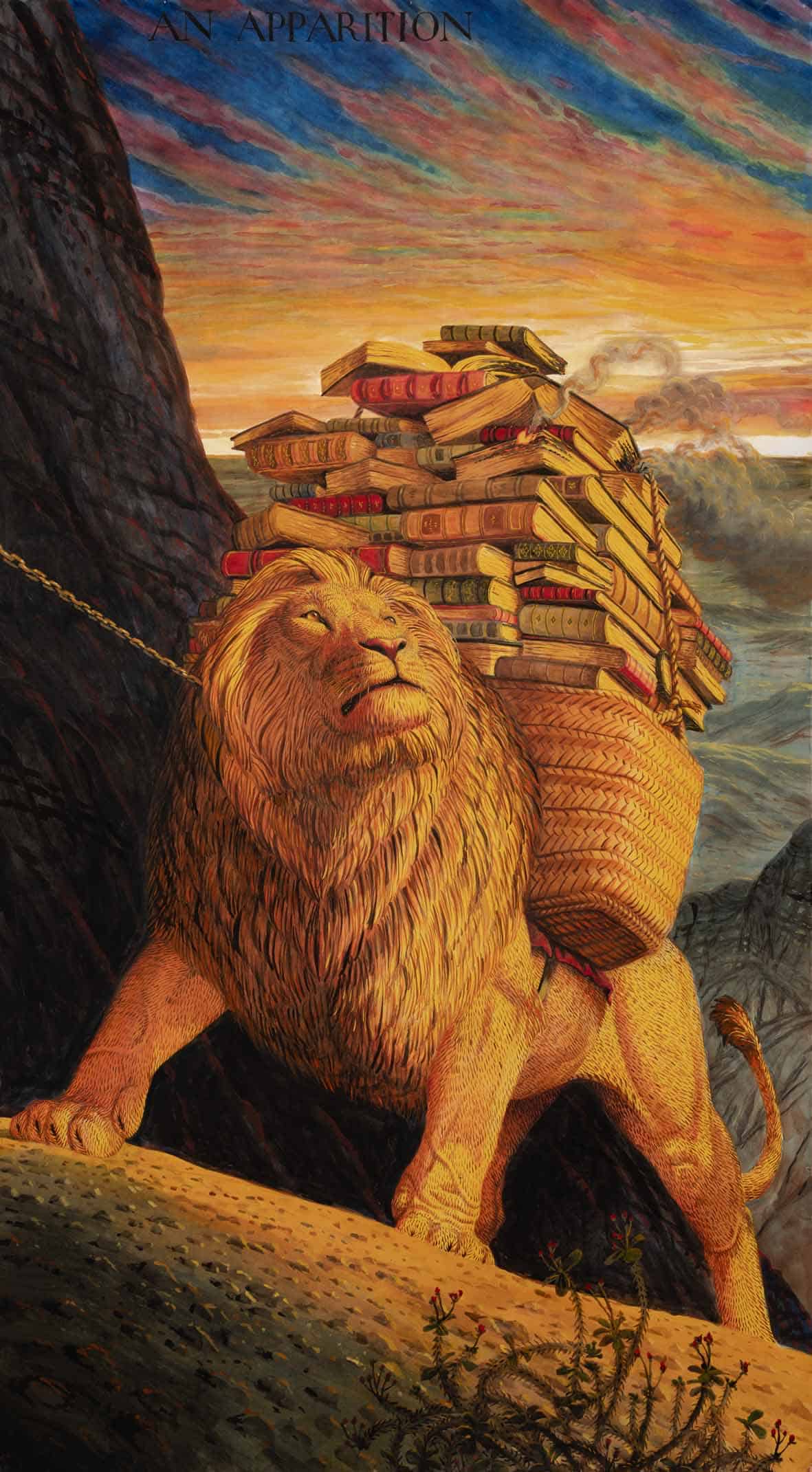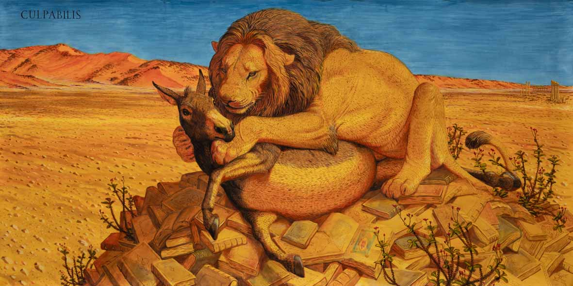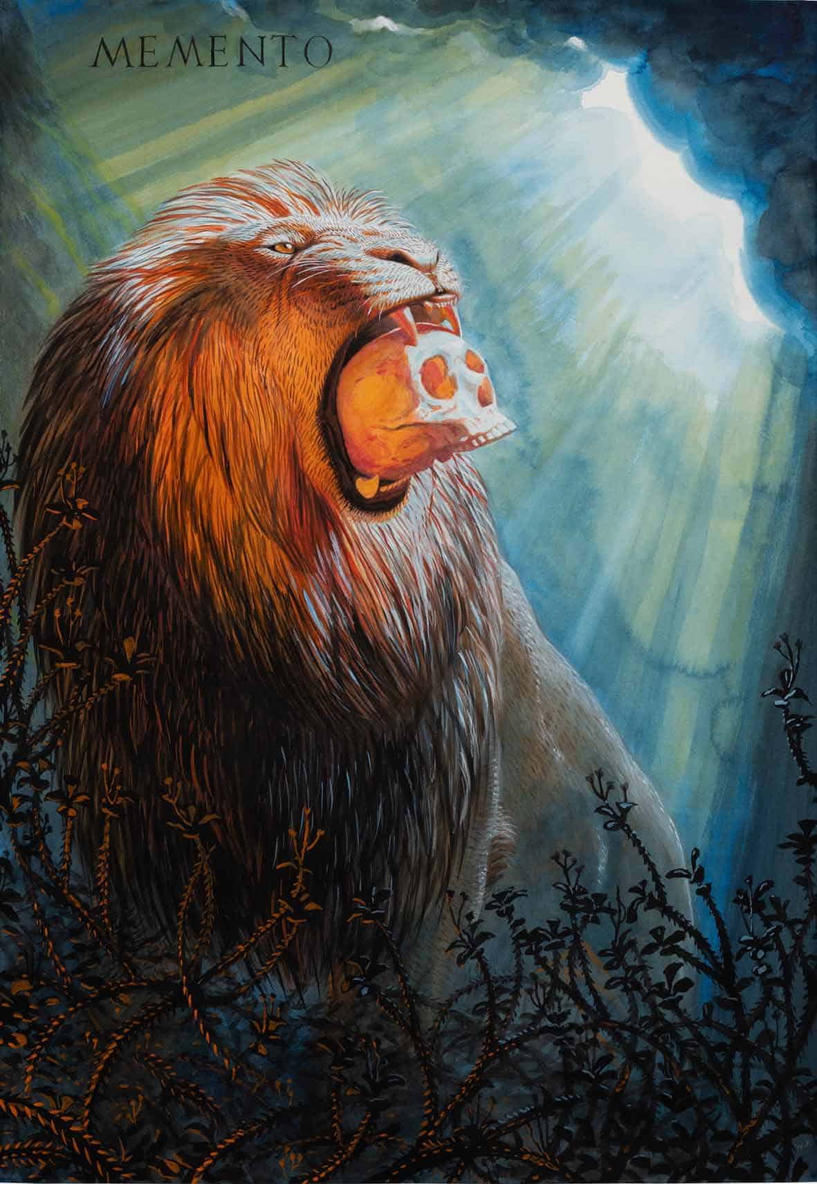 Una sera mentre Girolamo si trovava assieme ai confratelli, apparve all’improvviso un leone zoppicante. Mentre tutti scappavano atterriti, lui accolse amorevolmente l’animale e, resosi conto che era stato ferito da alcune spine, curò la sua zampa. Da quel momento il leone abbandonò gli istinti feroci vivendo con i confratelli come un animale domestico. Lo troviamo in tutte le raffigurazioni di San Girolamo, ma grazie a Walton Ford che ha tratto ispirazione dall’opera letteraria, percepiamo la narrazione in modo molto diverso. Non solo bellezza estetica ma una profonda indagine filosofica sulle questioni urgenti del nostro tempo come lo sfruttamento ambientale e l’arroganza della natura umana di ieri e di oggi.