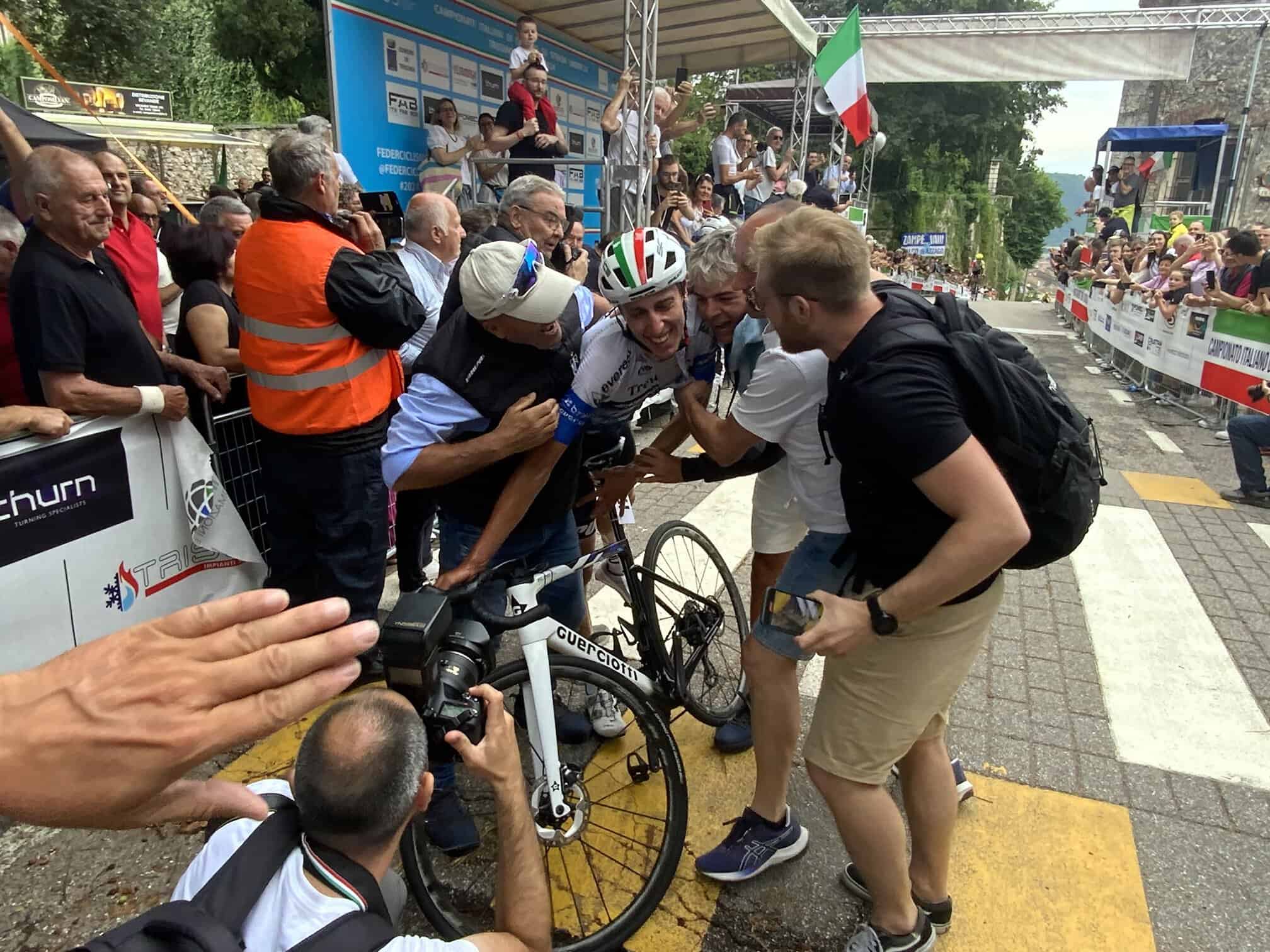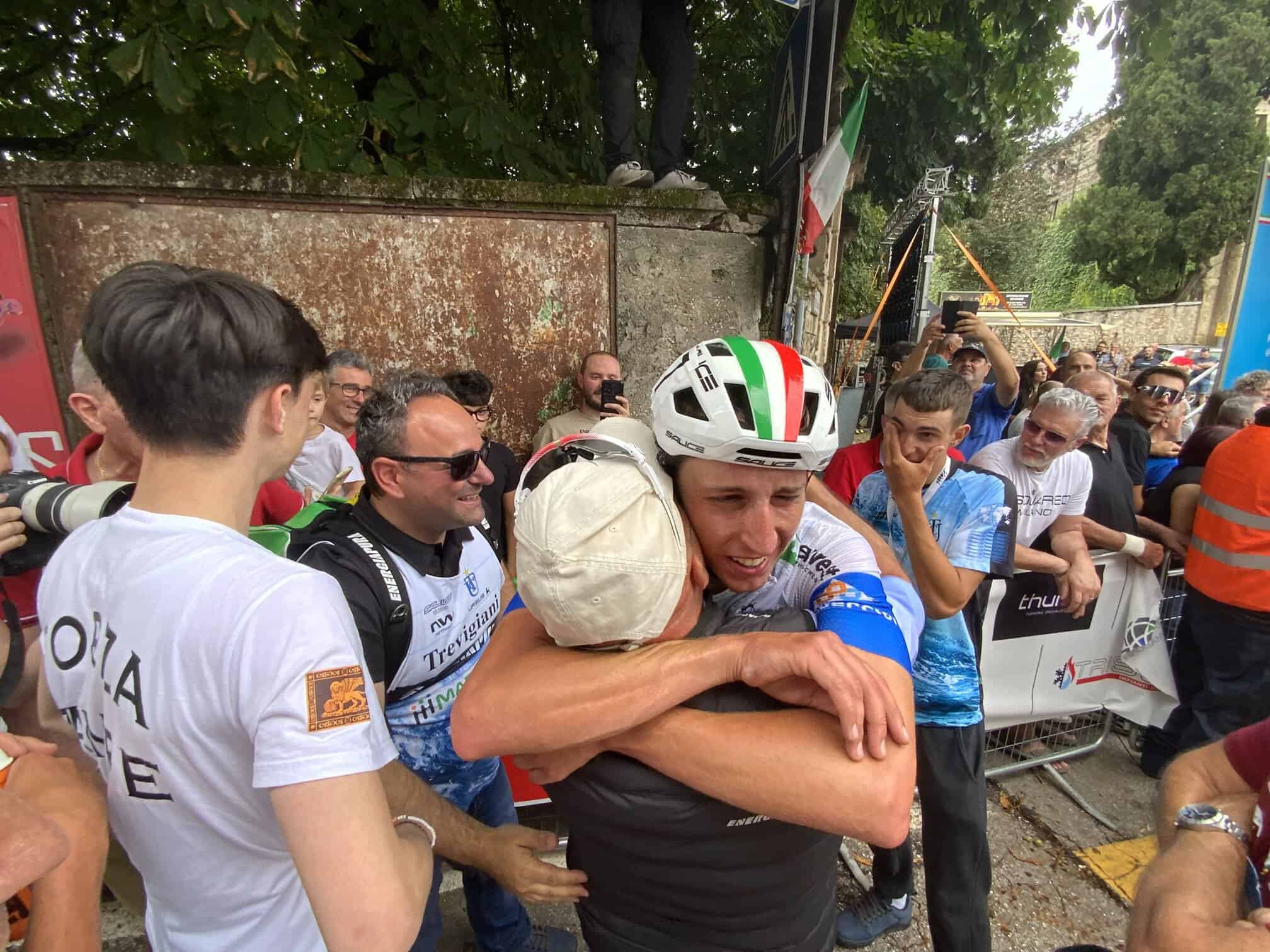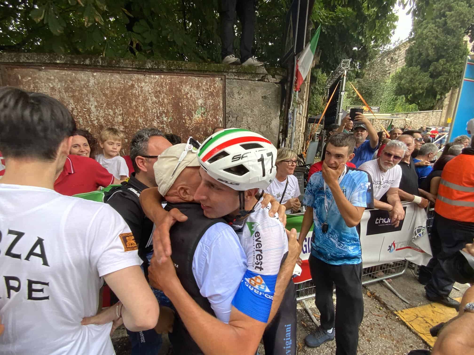 Subito è abbracciato da Marco Di Bernardo e Luca Rosa visibilmente commosso. Poi arrivano Simone Griggion, Maurizio Cetto, grande protagonista della gara e Gianmarco Carpene, veronese come Edoardo. L’incontenibile esultanza dei parenti e dei tifosi presenti sulla rampa dell’arrivo di Trissino. E poi di tutto lo staff formato dal project manager Luciano Marton, dal direttore sportivo Mauro Busato e dal meccanico Gabriele Donadi.