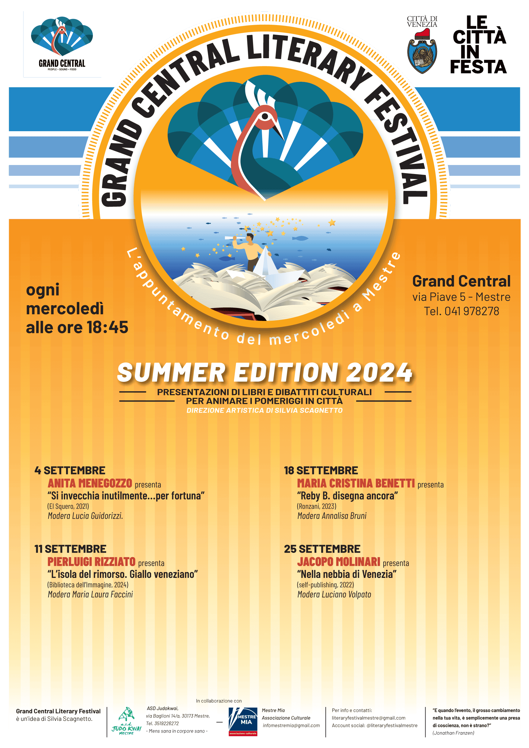 Mercoledì 4 settembre, alle 18.45, al bistrot Grand Central di Mestre, riprenderà il Grand Central Literary Festival – Summer Edition 2024, la rassegna di incontri con gli scrittori nata nel 2021 da un’idea di Silvia Scagnetto.