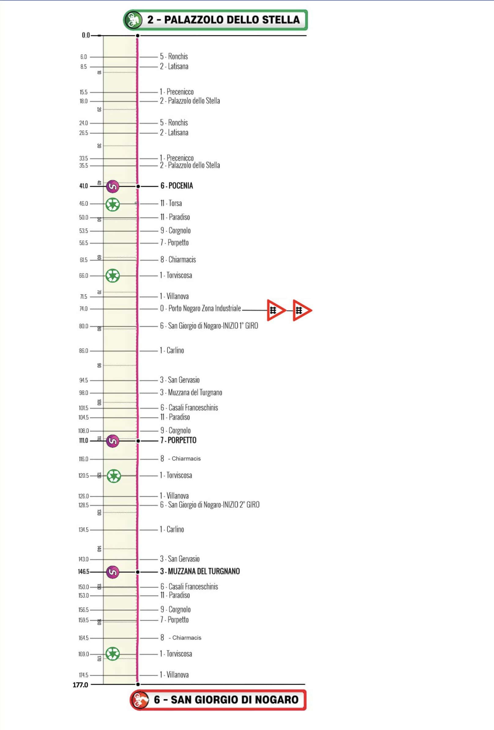 Palazzolo dello Stella, Ronchis, Latisana, Precenicco, Palazzolo dello Stella, Ronchis, Latisana, Precenicco, Palazzolo dello Stella, Pocenia, Torsa, Paradiso, Corgnolo, Castello, Porpetto, Chiamarcis, Torviscosa, Villanova, San Giorgio di Nogaro, Località Galli, Carlino, San Gervasio, Muzzana del Turgnano, Casali Franceschinis, Località bivio Paradiso, Corgnolo, Castello, Porpetto, Chiamarcis, Torviscosa, Villanova, San Giorgio di Nogaro, Località Galli, Carlino, San Gervasio, Muzzana del Turgnano, Casali Franceschinis, Località bivio Paradiso, Corgnolo, Castello, Porpetto, Chiamarcis, Torviscosa, Villanova, San Giorgio di Nogaro di 177 chilometri. Partenza Palazzolo dello Stella alle ore 12:30. L’arrivo è a San Giorgio di Nogaro in via Roma verso le 16:30.
