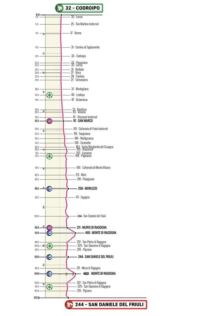 Codroipo, Passariano, Lonca, San Martino, Muscletto, Roveredo, Varmo, Belgrado, Straccis, Bugnins, Camino al Tagliamento, Gorizzo, Iutizzo, Codroipo, Passariano, Lonca, Bertiolo, Virco, Flambro, Talmassons, Mortegliano, Lestizza, Sclaunicco, Basiliano, Variano, Blessano, San Marco, Colloredo di Prato, Nogaredo di Prato, Faugnacco, Martignacco, Ceresetto, Santa Margherita del Gruagno, Brazzacco, Lazzacco, Pagnacco, Modoletto, Colloredo di Monte Albano, Mels, Paradise, Pissignano, Moruzzo, Fagagna, San Daniele del Friuli, Muris di Ragogna, Monte di Ragogna, San Pietro di Ragogna, San Giacomo di Ragogna, Pignano, San Daniele del Friuli, Muris di Ragogna, Monte di Ragogna, San Pietro di Ragogna, San Giacomo di Ragogna, Pignano, San Daniele del Friuli di 147 chilometri. Partenza da Codroipo alle 12:30; arrivo a San Daniele del Friuli verso le ore 16.
