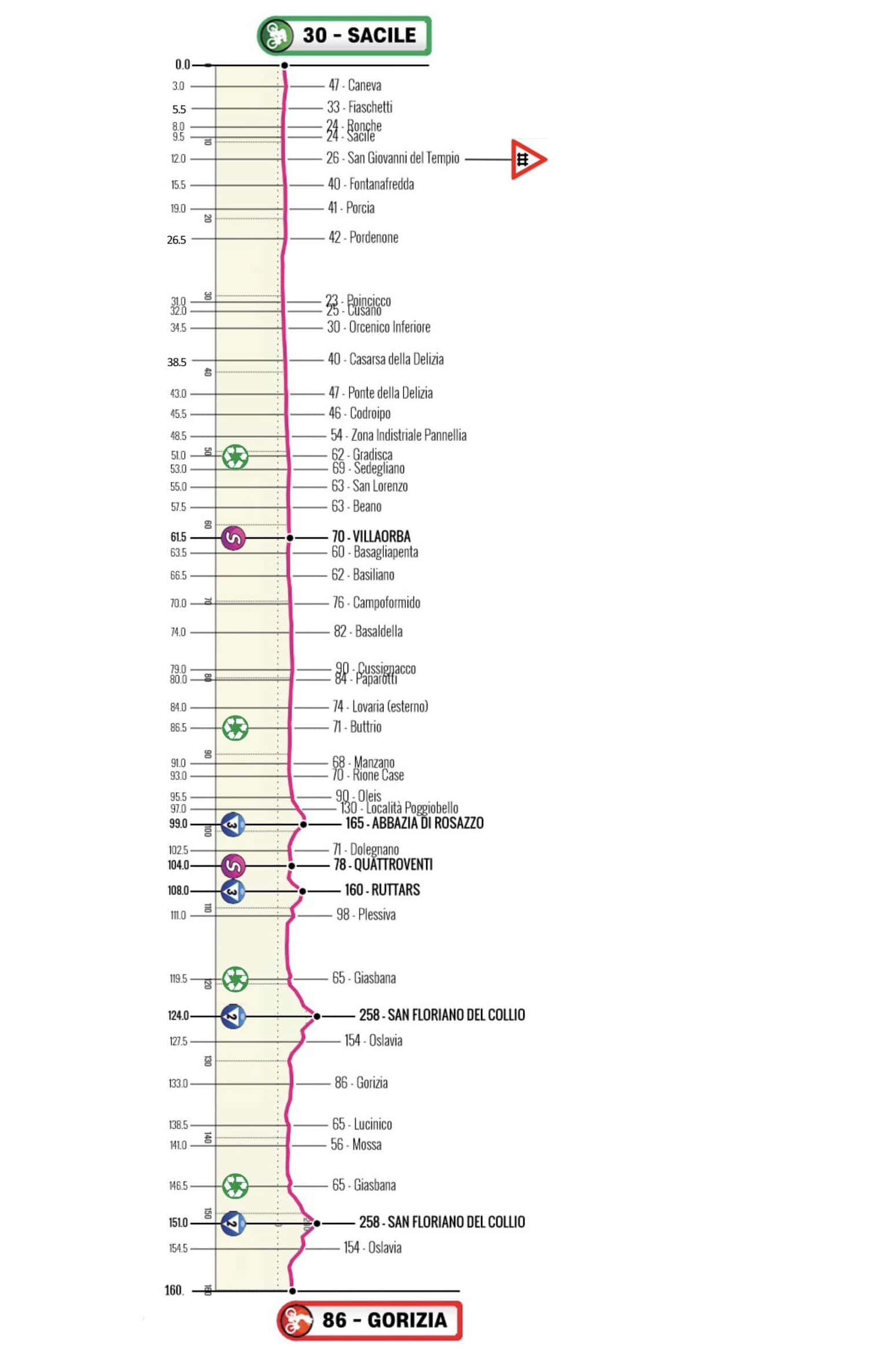 Sacile, San Michele di Sacile, Caneva, Fiaschetti, Ronche, Sacile, San Giovanni del Tempio, Fontanafredda, Porcia, Pordenone, Poincicco, Cusano, Orcenico Inferiore, Casarsa della Delizia, Ponte della Delizia, Codroipo, Zona Industriale Pannellia, Gradisca, Sedegliano, San Lorenzo, Beano, Villaorba, Basagliapenta, Basiliano, Campoformido, Basaldella, Cussignacco, Paparotti, Lovaria, Buttrio, Manzano, Rione Case, Oleis, Poggiobello, Abbazia di Rosazzo, Dolegnano, Quattroventi, Sant’Andrat dello Judrio, Casali Gallo, Trussio, Ruttars, Ancona, Cavezzo, Plessiva, Picolla, Zegla, Giasbana, Uclanzi, Bucuie, Bivio, San Floriano del Collio, Oslavia, Piuma, Gorizia, Lucinico, Mossa, Giasbana, Uclanzi, Bucuie, Bivio, San Floriano del Collio, Oslavia, Piuma, Gorizia di 160 chilometri. Partenza da Sacile alle ore 12:30. Arrivo a Gorizia verso le ore 16:30.