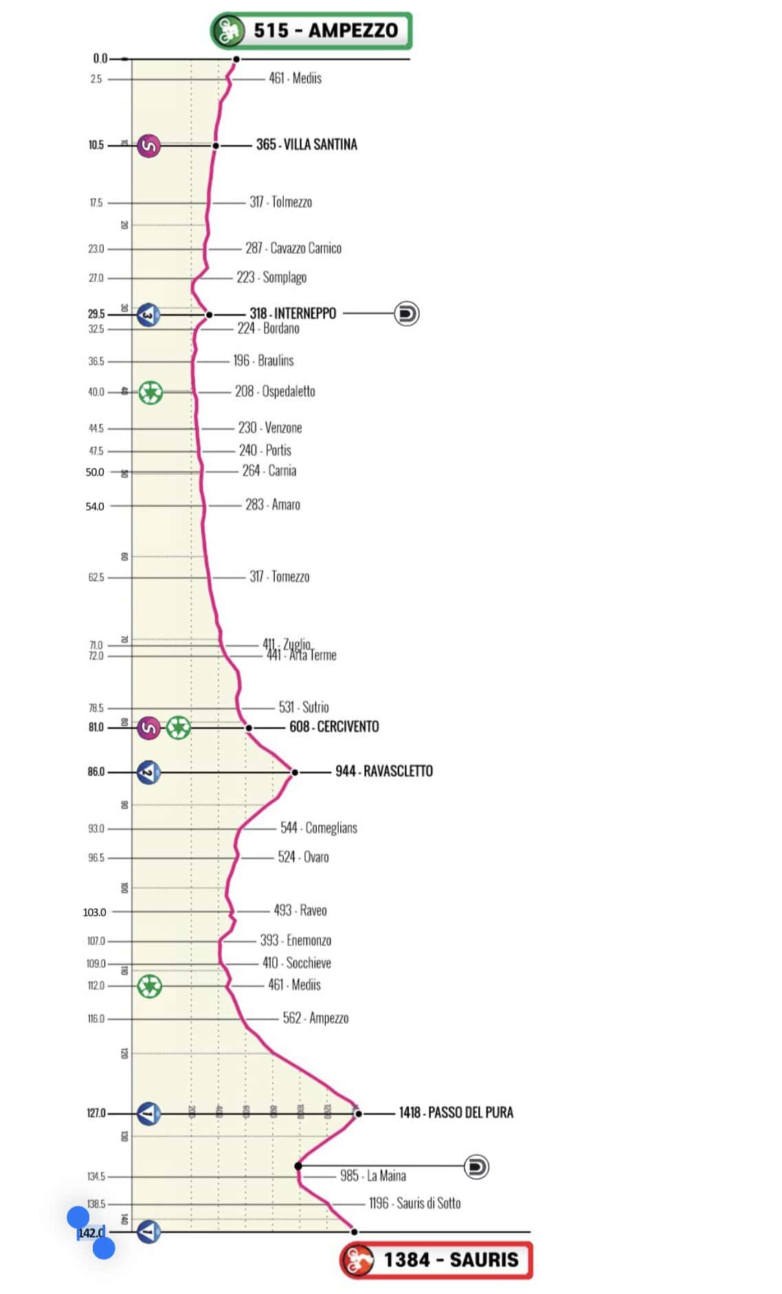 Ampezzo, Mediis, Enemonzo, Quinis, Esemon di Sotto, Villa Santina, Tolmezzo, Verzegnis, Cavazzo Carnico, Somplago, Interneppo, Bordano, Braulins, Pineta, Campagnola, Ospedaletto, Venzone, Portis, Carnia, Amaro, Cavazzo Carnico, Tolmezzo, Caneva, Casanova, Lorenzaso, Terzo, Formeaso, Zuglio, Arta Terme, Avosacco, Piano D’Arta, Paluzza, Sutrio, Cercivento, Zovello, Ravascletto, Povolaro, Comeglians, Ovaro, Raveo, Colza, Enemonzo, Socchieve, Mediis, Ampezzo, Passo del Pura, La Maina, Sauris di 142 chilometri. Partenza ad Ampezzo alle ore 12.30. Arrivo a Sauris di Sopra verso le ore 16:30.