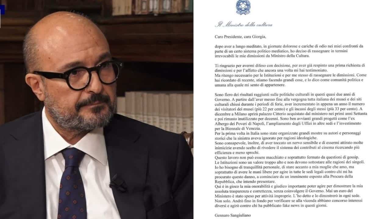 Gennaro Sangiuliano ha lasciato il posto di ministro della Cultura dopo “giornate dolorose e cariche di odio nei miei confronti da parte di un certo sistema politico mediatico”, come ha scritto nella lettera alla Presidente del Consiglio Giorgia Meloni.