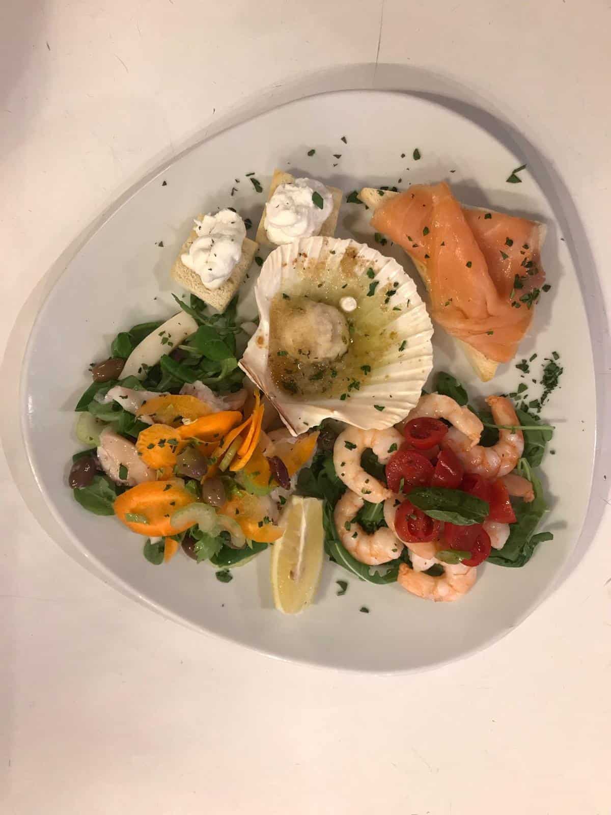 Preparazione . Cuociamo in forno caldo ventilato le capesante avendo cura di toglierle dopo 4 minuti, sgusciare i gamberi portarli all’ebollizione, toglierli e lasciarli riposare, provvediamo poi a tagliare a fettine il salmone, le verdure, e predisponiamo il piatto a nostro piacimento avendo cura di abbellirlo con verdurine, pomodorini, carote. Possiamo fare delle varianti aggiungendo altri crostacei e arricchendo il piatto.