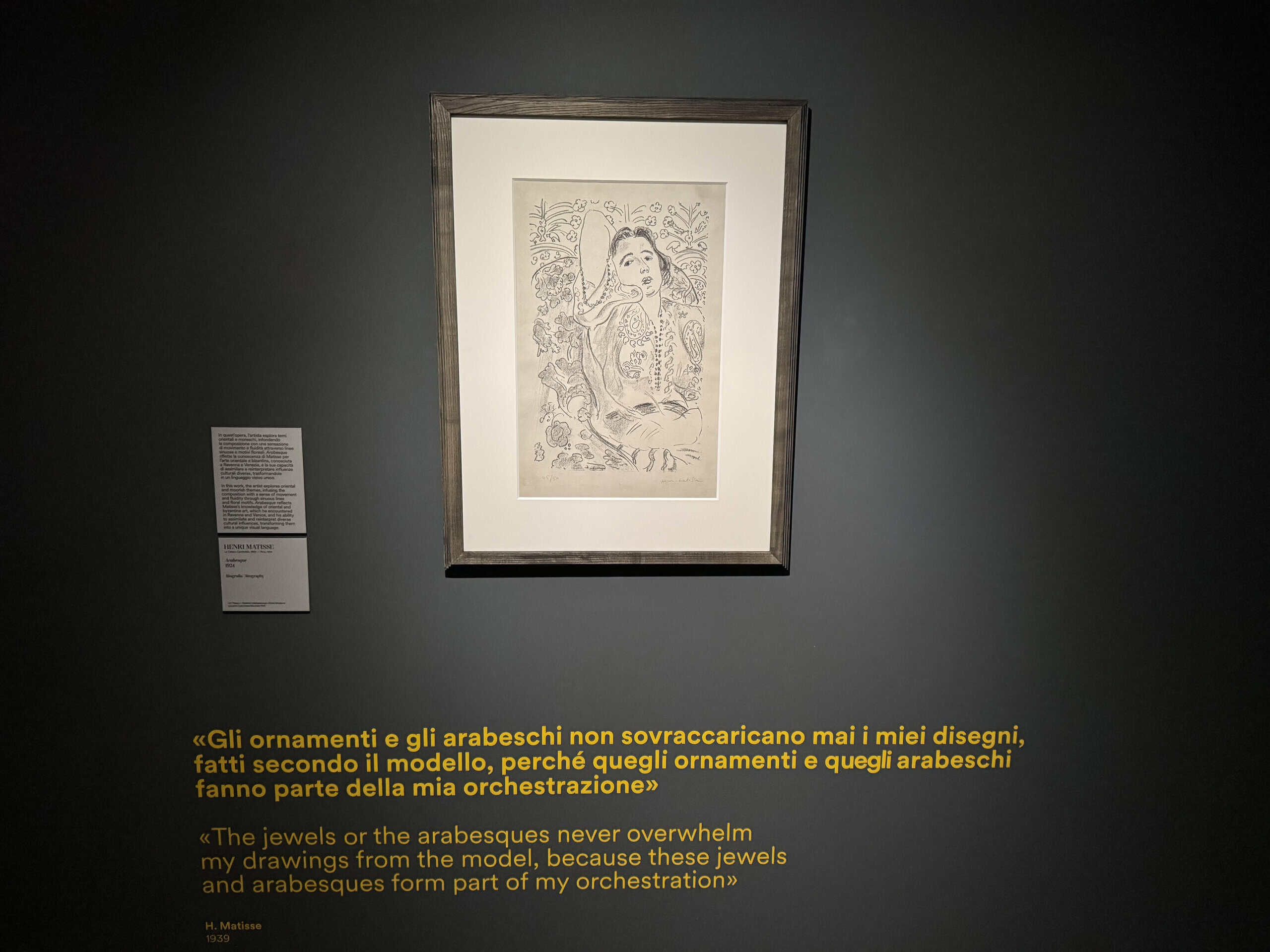 Sette sezioni, cinquantadue opere esposte, tra cui dodici sono di Henri Matisse (Le Cateau-Chambrésis, 1869 – Nizza, 1954) cinque conservate a Ca’ Pesaro, le altre concesse in prestito da prestigiose istituzioni: il Philadelphia Museum of Art, la Národní Galerie di Praga, il Musée des Beaux-Arts di Bordeaux, il Musée des Beaux-Arts di Nancy, il Centre Pompidou di Parigi, il Musée Albert-André di Bagnols-sur-Cèze, il Museo del Novecento di Milano.