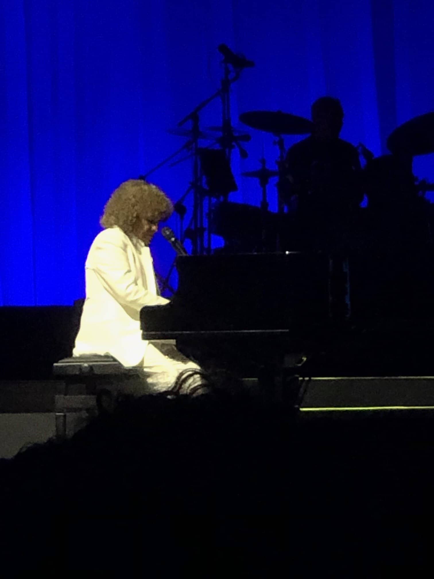 E arrivano direttamente al cuore canzoni come “Quando finisce un amore”, struggente al punto da far scattare in piedi tutto il pubblico dell’Arena. Un fiume in piena che prosegue alternandosi tra il pianoforte e brevi passeggiate da una parte e l’altra del palco. All’improvviso annuncia l’arrivo di una brava e giovane cantante. Entra in scena Elodie, elegantissima, fasciata in un lungo abito nero con la quale duetta la canzone “E mi arriva il mare” dedicata a Nelson Mandela.