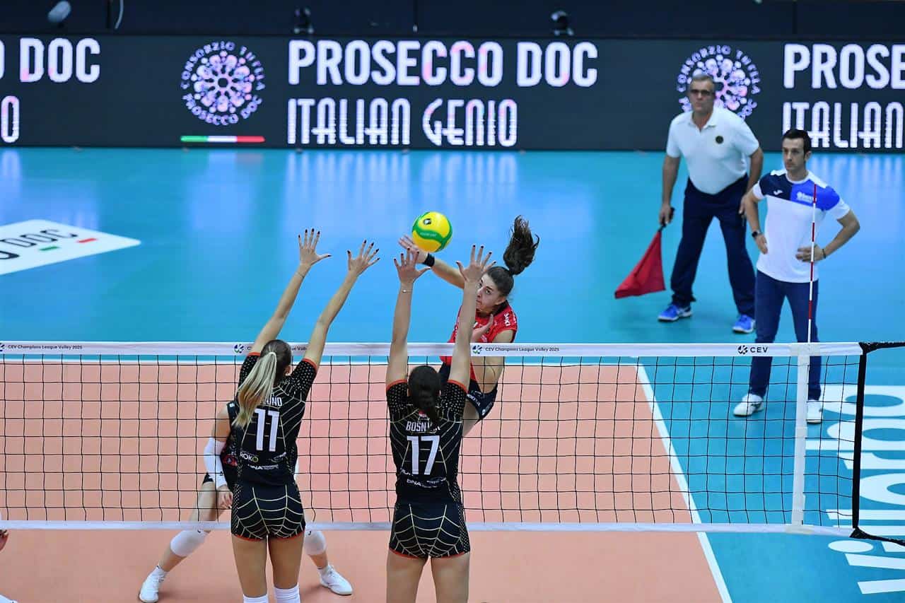Esordio vincente nell’edizione 2024-25 per l’A.Carraro Imoco Conegliano, campionesse in carica, che inaugura la Pool A da detentrice della massima coppa europea con un secco 3-0 contro le croate del Mladost Zagabria. Coach Santarelli dà un turno di riposo a molte delle sue “big” schierando un “sei+uno” inedito con al palleggio la giapponese Seki, opposta Merit Adigwe, schiacciatrici Lukaisk e Lanier, con giovani prodotti del vivaio gialloblù a svolgere un ruolo da protagoniste: Bardaro, Adigwe ed Eckl. Il set più combattuto è il primo. All’inizio l’entusiasmo delle giovani croate crea qualche grattacapo alla squadra di casa, che poi è brava a ricompattarsi e a trovare concretezza e solidità.