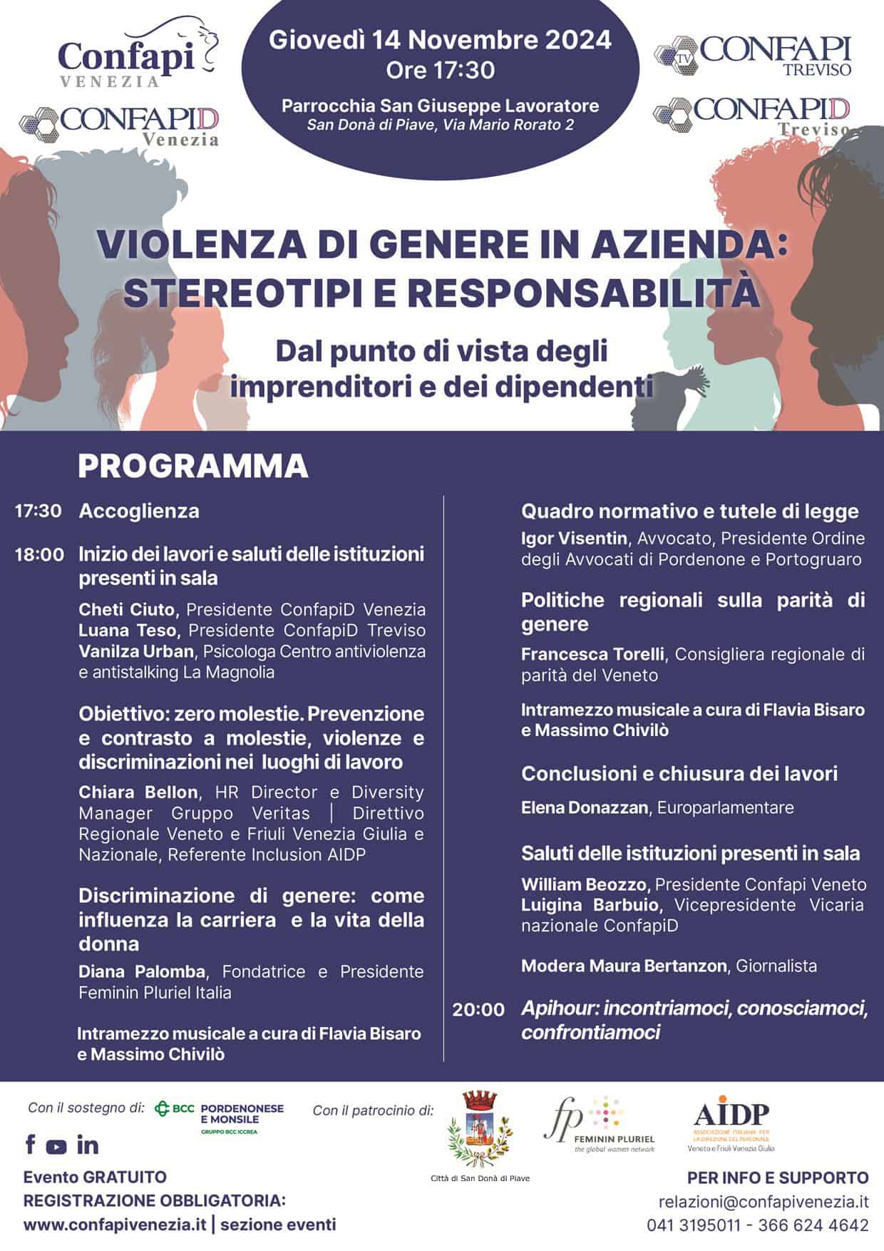 Tra gli interventi previsti ci sarà quello di Chiara Bellon, manager del gruppo Veritas, che parlerà della prevenzione e il contrasto a molestie, violenze e discriminazioni nei luoghi di lavoro. Quindi Diana Palomba, fondatrice e presidente Feminin Pluriel Italia, che darà uno spaccato su come la discriminazione di genere influenza la carriera e la vita della donna. A dare un quadro normativo al fenomeno ci sarà Igor Visentin, presidente dell’Ordine degli Avvocati di Pordenone e Portogruaro. Francesca Torelli, consigliera regionale di parità del Veneto, fornirà una panoramica sulle politiche regionali dedicate alla parità di genere. Prevista la presenza dell’europarlamentare, già assessore regionale, Elena Donazzan.