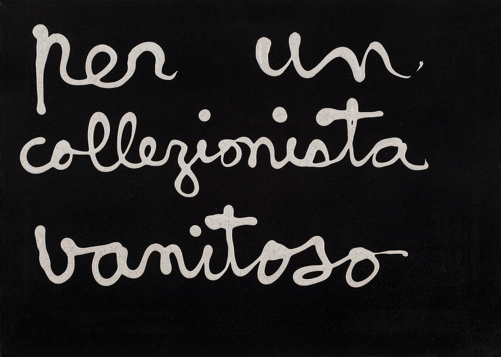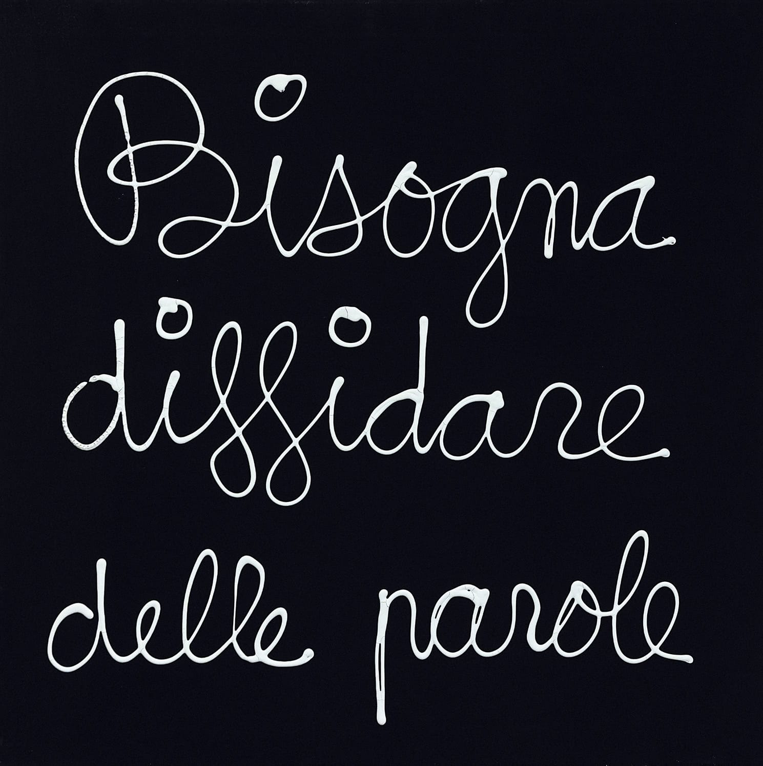 Si può pensare di suddividere le opere presentate in mostra in tre tipologie: opere di sola scrittura, opere con scrittura e fotografia e, infine, opere con scrittura in relazione alla materialità degli oggetti (è qui che di solito emerge il suo aspetto più ludico e sfrontato). Una serie cospicua di opere appartenenti alla prima tipologia ci consegna l’iconografia più classica della sua produzione artistica: singole parole o frasi brevi che abitano un campo monocromatico.