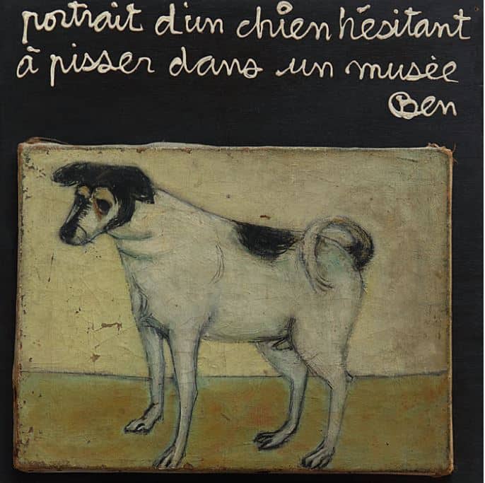 La sua scrittura si amplia in seguito dalla semplice firma a brevi testi di carattere descrittivo, concettuale o provocatorio, che vengono riportati sulla superficie degli oggetti o campeggiano solitari su quella di tele e tavole di legno. Nel 1962 raggiunge Daniel Spoerri a Londra, dove vive per 15 giorni nella vetrina della Gallery One, e incontra George Maciunas che lo invita a far parte del movimento internazionale intermedia Fluxus. Scopo del movimento è superare le categorie tradizionali dell’arte. E annullare, attraverso la performance, l’happening e il teatro totale, i confini tra l’arte e la vita. Di Fluxus Ben diventa uno dei più importanti esponenti, dando vita ad azioni spiazzanti quanto leggendarie, in seguito raccontate da un ciclo di lavori chiamato Gestes.