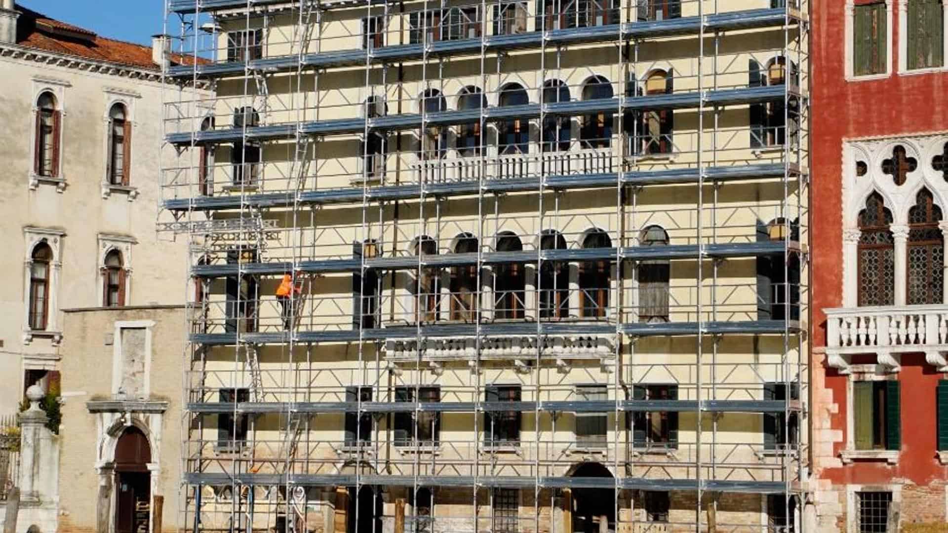 E, da quel momento, il palazzo è rimasto in attesa di completamento, fino ad ora. Proprio ieri, infatti, sono stati ultimati i lavori di allestimento ponteggio dalla trevigiana Euroedile di Postioma di Paese (TV), azienda specializzatanelle strutture provvisionali per edifici logisticamente complessi (come spesso accade a Venezia, data la particolare conformazione urbanistica della città lagunare). Prodotto dalla Pilosio, il ponteggio in alluminio, caratterizzato da particolare leggerezza e resistenza all’umidità, servirà alle maestranze della Pasqualucci per portare a termine l’intervento di ristrutturazione dello storico edificio, anche nelle facciate esterne.