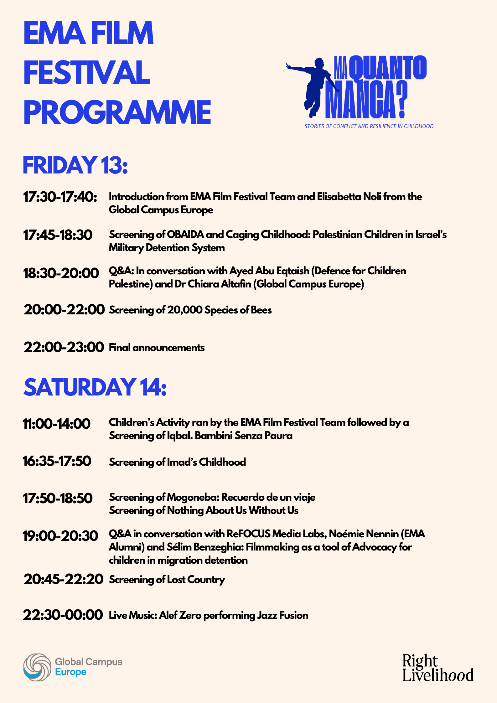 Il tema di quest’anno cattura il desiderio universale di un futuro più luminoso, dando anche voce alle prospettive dei bambini in varie situazioni di difficoltà. In un mondo in cui molte giovani vite sono colpite da sfollamento, violenza e instabilità, Ma Quanto Manca? Storie di conflitti e resilienza nell’infanzia mette in luce la forza dei bambini che affrontano queste sfide. Dalle narrazioni personali alle storie della comunità, esaminando l’impatto globale dei conflitti sull’infanzia.