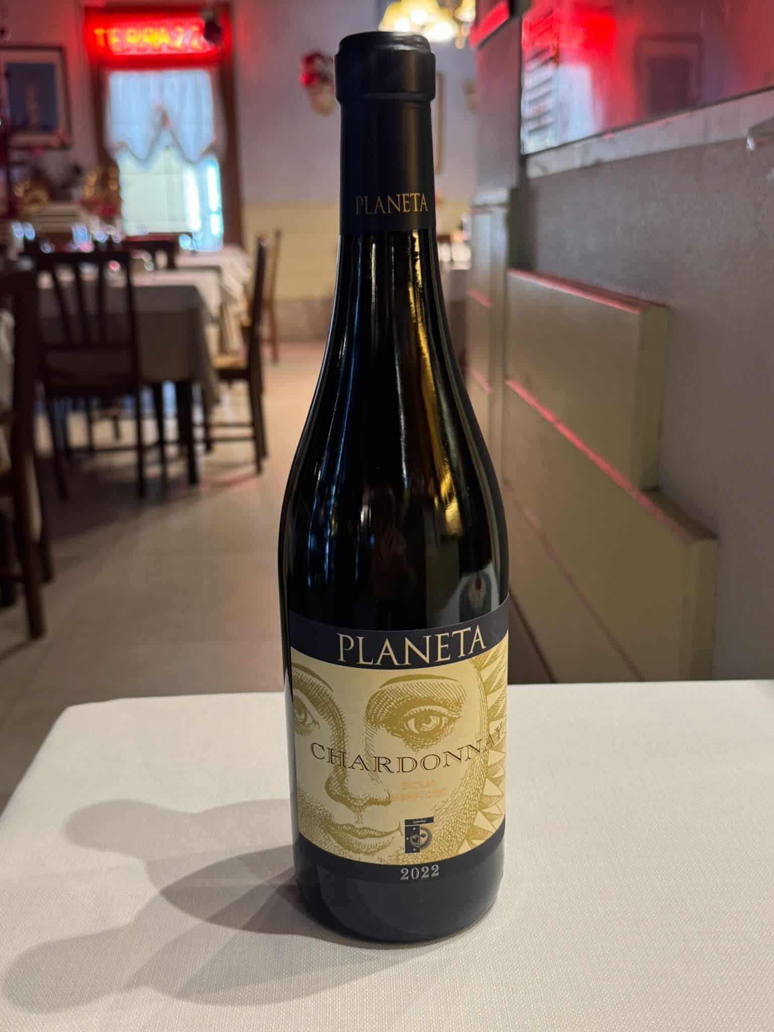 Per il vino in abbinamento  Simone  propone un Chardonnay Planeta siciliano. Un vino che lui, proveniente dall’isola, conosce bene:  corposo, di buona struttura maturato per 12 mesi in barrique. In bocca è morbido, cremoso e croccante e fa sentire molto il sole della  sua Trinacria.