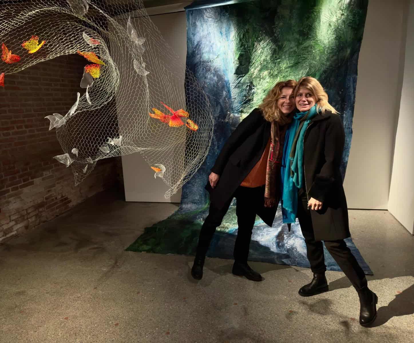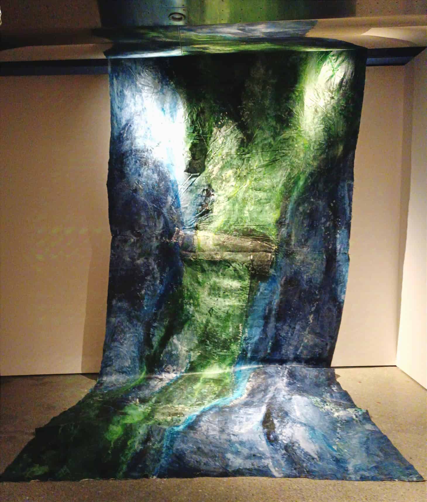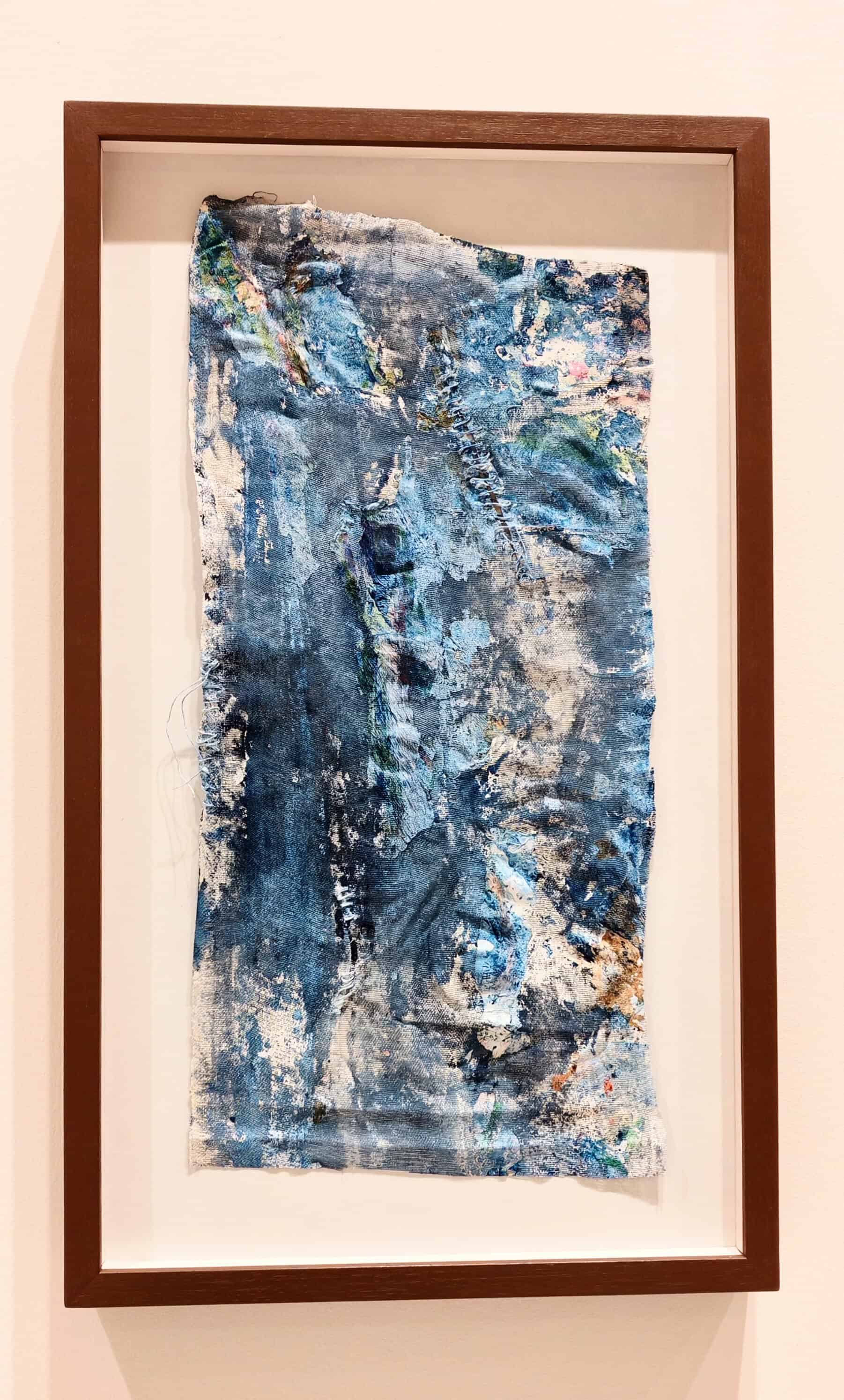 A sua volta Acque Lagunari (tecnica mista su tela e Juta),la grandestoffa strappata e ricucita di Luana Segato, che molti di noi ricordano adagiata in performance su ponti e campi veneziani, azzurra di laguna nei giorni increspati dal vento, fiume dai riflessi smeraldo, si inquadra alla perfezione sulla scena del Museo. L’artista dipinge, taglia e ripara; ricostruisce lo spazio, per aver cura del mondo; ne serba le memorie, in forma di cicatrici, ad indicare antichi linguaggi. Sulla parete vicina, una serie di piccoli Pesci blu decontestualizzati, in argilla, acrilico su tela e tessuto, ribadiscono l’anima tutta concettuale di Luana, la sua inesausta sperimentazione: come dimenticare i suoi Ghebi, i Canal Grande in cui forma e contenuto si compenetrano in un unico, inimitabile logo?