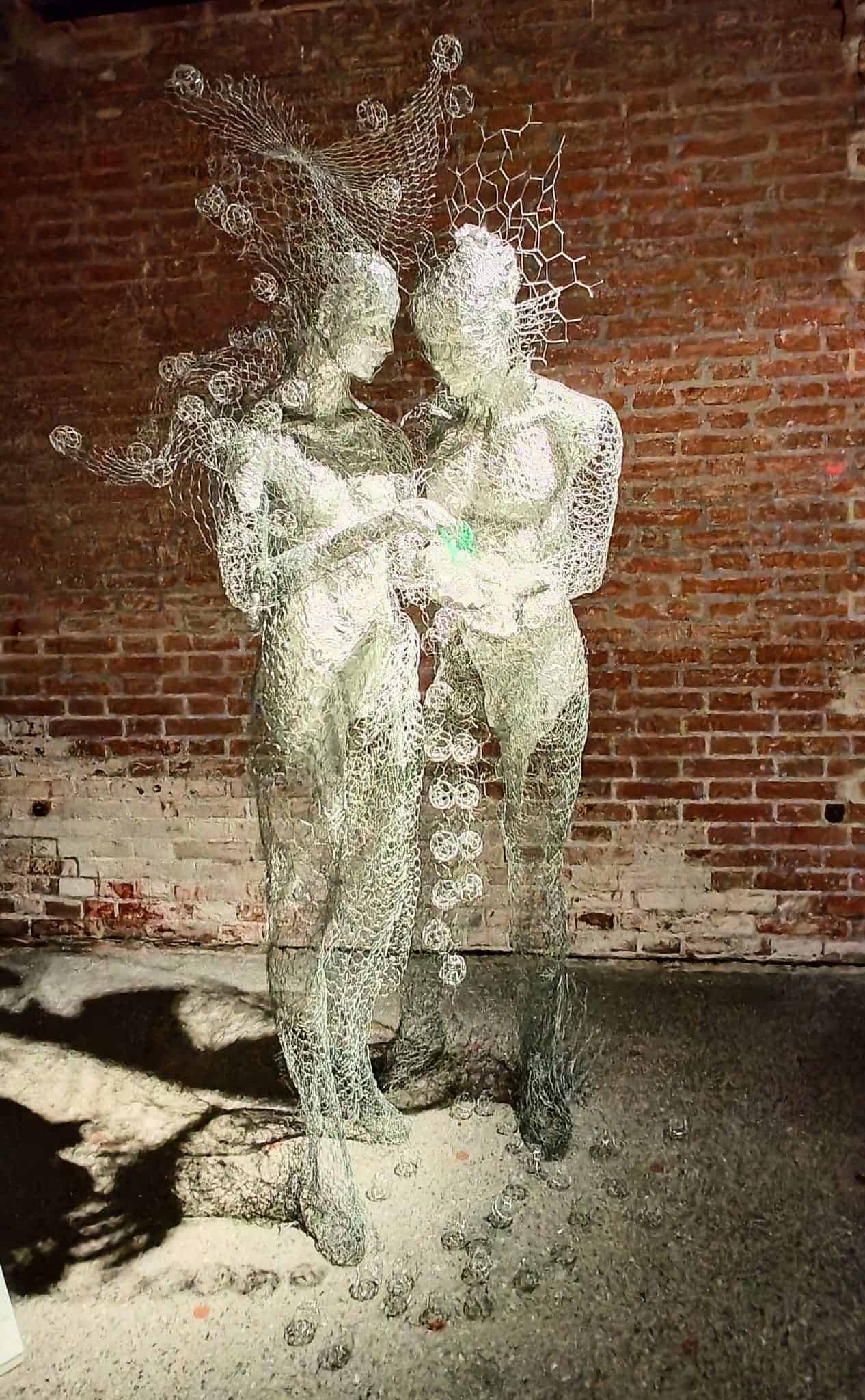 Lo spazio a piano terra è piccolo, ma prestigioso; l’armonia tra i due mondi espressivi è tangibile, nonostante la diversità degli strumenti utilizzati. Da un lato, la leggerezza boschiva di Paola, i corpi a cui la texture metallica offre un’incredibiletridimensionalità, attraversata da bagliori. È vita fisica, quella del suo Amore e Psiche in rete metallica, ferro zincato e alluminio, e – allo stesso tempo – è idea: maglia lucente a simboleggiare ogni connessione, esistenza che trascende la materia. Il metallo definisce spazi in forme frattaliche, ma i corpi che si toccano hanno una densità plastica che commuove, prendono tutti i colori dello spazio circostante, con un gusto del modellato pieno e rotondo. Madormo osa la rete anche come quinta teatrale con Il Velo, strumento scenico di grande raffinatezza a definire i piani prospettici.