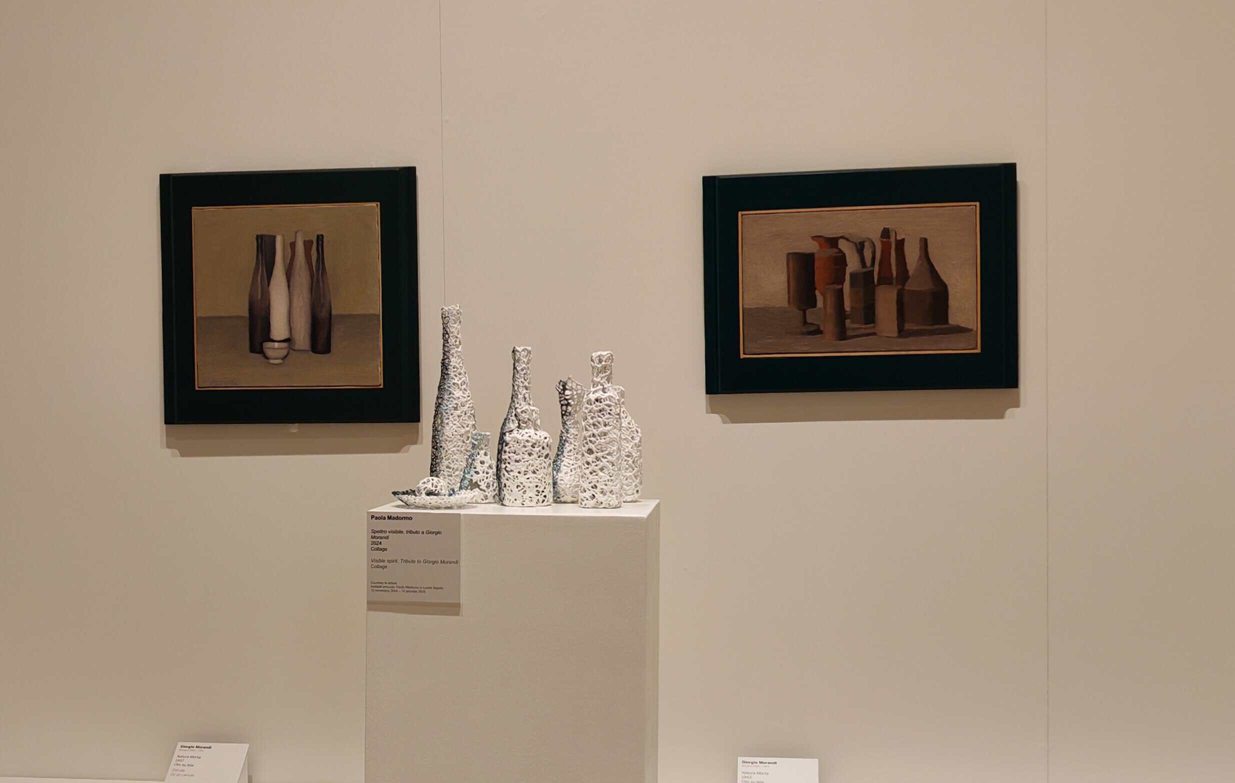 Il loro viaggio condiviso culmina, nella mostra di Ca’ Pesaro, con un richiamo nelle collezioni permanenti: una stoffa incorniciata, Un pezzo di cielo(acrilico su tarlatana) per Luana Segato, giusto di fianco alle Signorine di Felice Casorati; un matericoSpettro visibile – Tributo a Morandi (collage 3D) per Paola Madormo, accanto ad una teletta capolavoro del bolognese. Un’emozione per chi le conosce e le stima; forse un auspicio.