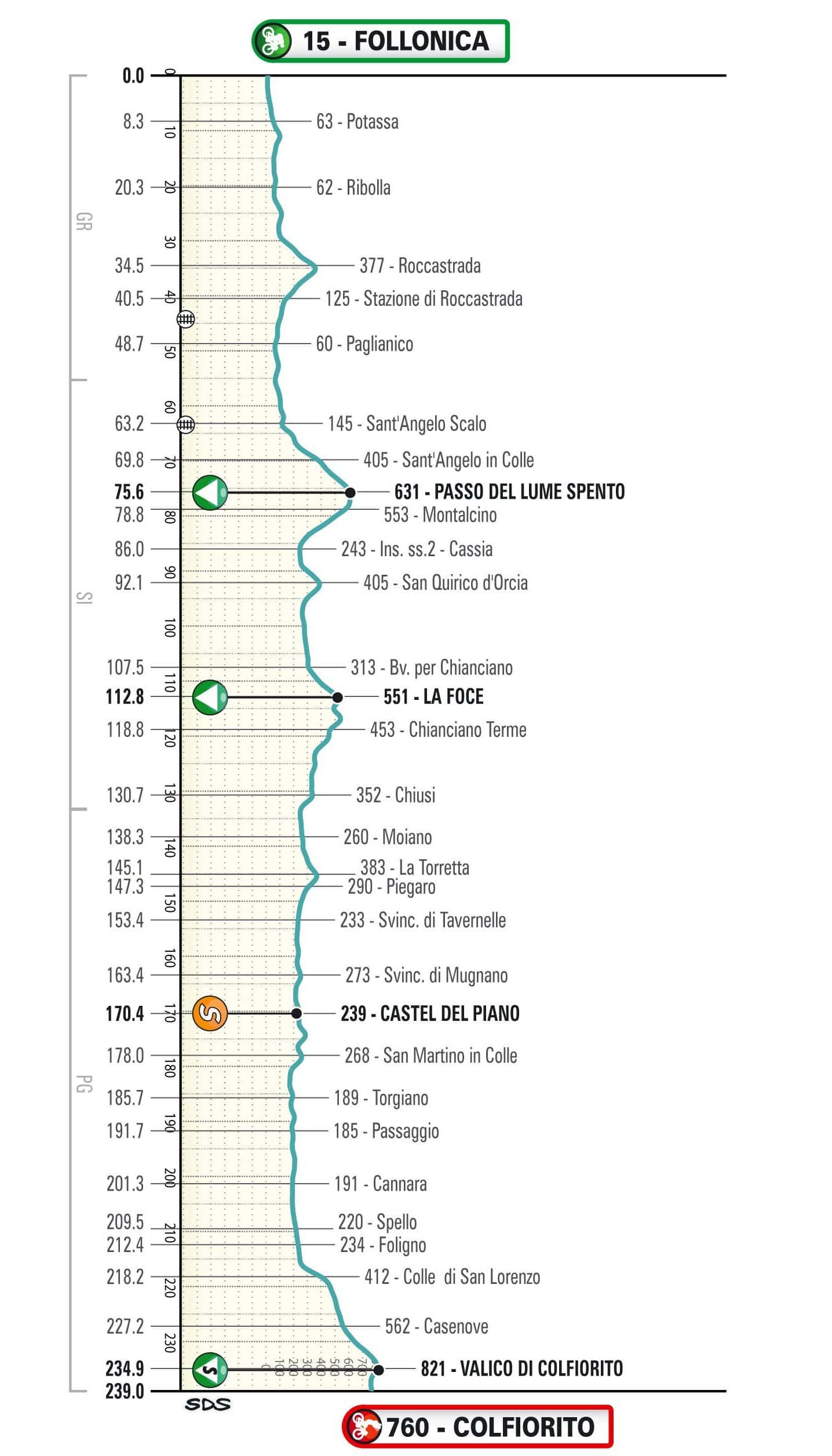 Tappa molto lunga e abbastanza ondulata nella prima parte. Partenza da Follonica per percorrere la parte settentrionale della provincia di Grosseto fino a sfiorare il Monte Amiata e attraversare il senese scalando il Passo del Lume Spento e la Foce fino a Montalcino e Chiusi. Dopo il percorso si addolcisce e lungo la piana del Trasimeno porta a Foligno attraverso strade prevalentemente rettilinee a volte con carreggiata ristretta. Superata Foligno si affronta la salita finale per il Valico di Colfiorito posto a circa 4 km dall’arrivo. Ultimi km. Ultimi chilometri in netta ascesa. Parte più dura all’inizio con tratti oltre il 10% e poi lungo falsopiano a salire fino al Valico. Breve discesa e dopo l’attraversamento dell’abitato di Colfiorito breve ascesa fino all’arrivo.