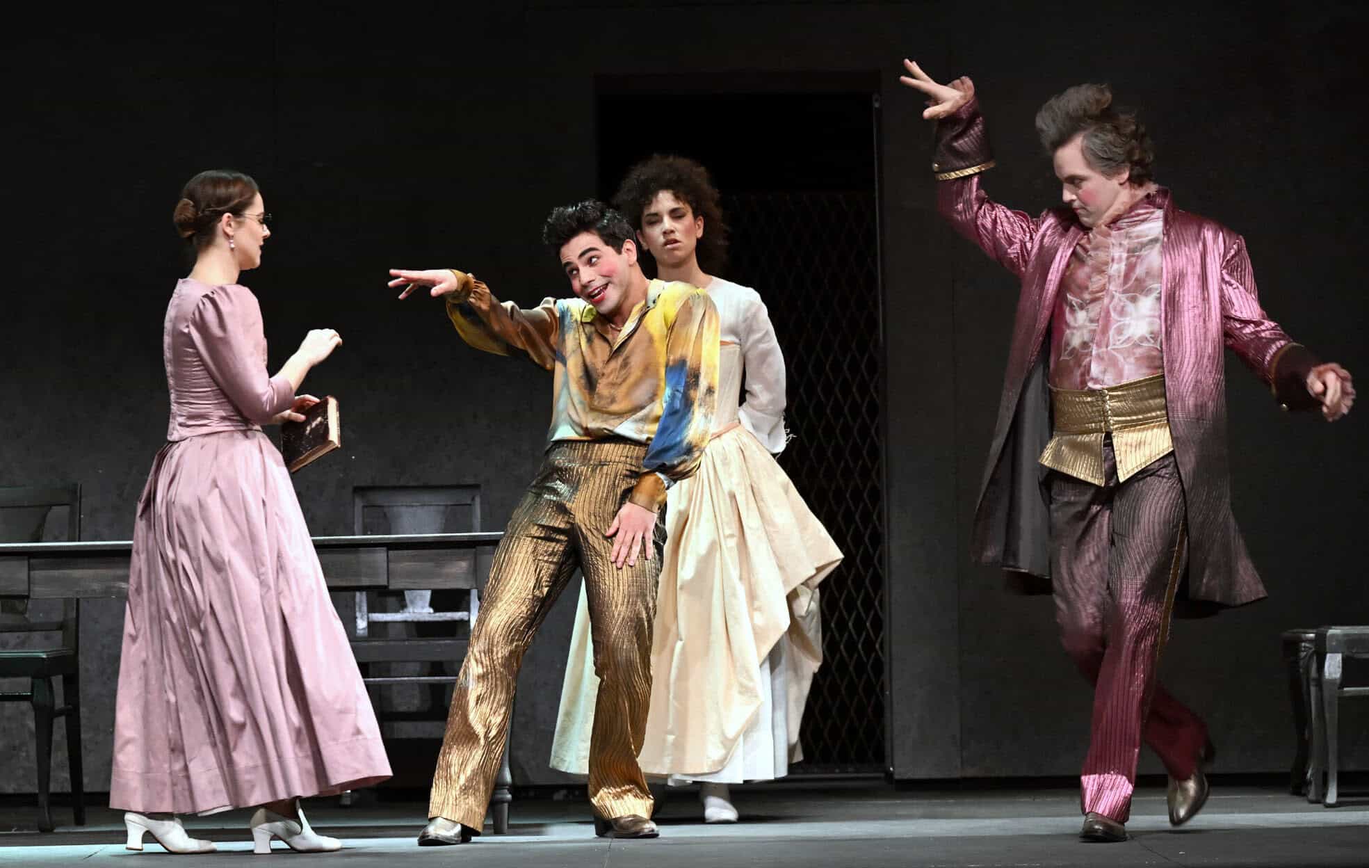 I costumi, curati nei minimi dettagli, non si limitano a una semplice riproduzione storica, ma diventano strumenti espressivi di fondamentale importanza. Ogni tessuto, ogni linea, ogni sfumatura racconta qualcosa di più del personaggio che li indossa: la sofisticata austerità “rosa cipria” di Rosaura si contrappone all’opulenza frivola e psicopatica, grigio-nera, della marchesa Beatrice. Il conte Ottavio indossa abiti che rivelano non solo il suo status, ma anche la sua fragilità interiore. E poi, c’è l’esplosione di colori e luccichii nei vestiti dei servitori, dei scrocchi e di Pantalone, il padre della protagonista, avvolto nel sanguigno rosso della sua lunga giacca, simbolo delle sue ansie e dell’amore per la figlia.