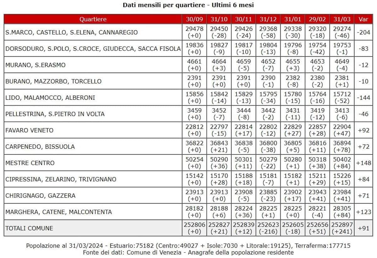Stigmatizza Ri-pensare Venezia (pag.15): “…I salari sono bloccati da 10 anni (governi Renzi, Gentiloni, Conte, Meloni, ndr) e in alcuni casi sono diminuiti. “Il 40% dei contribuenti (veneziani, ndr) dichiara al fisco un imponibile inferiore a 15 mila euro: un dato sorprendente in una città che accoglie ogni anno milioni di turisti e che ti aspetteresti molto più ricca. In realtà il turismo produce occupazioni povere e mal pagate – confermano i dati di Pellicani e Vianello – L’industria turistica traina la città e produce offerte di impiego che livellano verso il basso il mercato del lavoro. Un fenomeno che spiega anche le difficoltà prodotte dall’immigrazione, cresciuta esponenzialmente (+500% in 10 anni) ma assorbita interamente da un’offerta di impiego povero, dequalificato, precario. In 10 anni oltre 175 mila stranieri sono stati assunti nel turismo, quasi 30 mila dall’industria. In particolare da Fincantieri di Porto Marghera. Una stortura della base economica che produce difficoltà di integrazione e macroscopici fenomeni di ghettizzazione e zonizzazione (la nuova popolazione si è concentrata quasi interamente nelle aree di Mestre centro e Marghera, dove un abitante su quattro é straniero. Una situazione che, senza essere gestita, genera tensioni e conflitti sociali”.