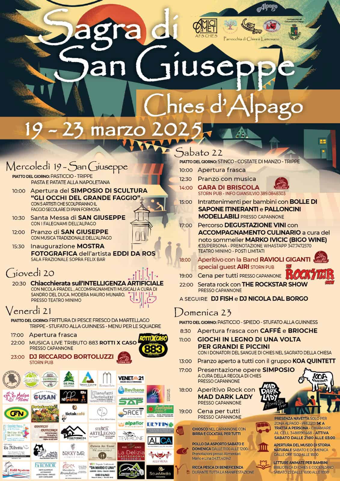 Quasi terminati i preparativi per la Sagra di San Giuseppe nella frazione di Chies d’Alpago. Cinque giorni e tante iniziative a cui si aggiunge un inedito simposio di scultori: da mercoledì 19 a domenica 23 marzo.  “Un evento dell’associazione Amici di MET – spiega Nicola Dal Borgo – in collaborazione con Pro Loco, Donatori del Sangue, Regola, Comune e Parrocchia. Partiremo mercoledì 19, giorno del Santo, con la Santa Messa alle ore 10.30. Proseguiremo giovedì con una serata sull’intelligenza artificiale a cura di Nicola Pradel. Poi continueremo il weekend con tanto cibo e tanta musica. Venerdì avremo i RottiXcaso, tribute band degli 883. Sabato invece i Rockstar Show, direttamente da Roma. Ma non solo, avremo anche l’apertura del Museo di Storia Naturale di Chies nel weekend e la pesca di beneficenza sempre attiva”.
