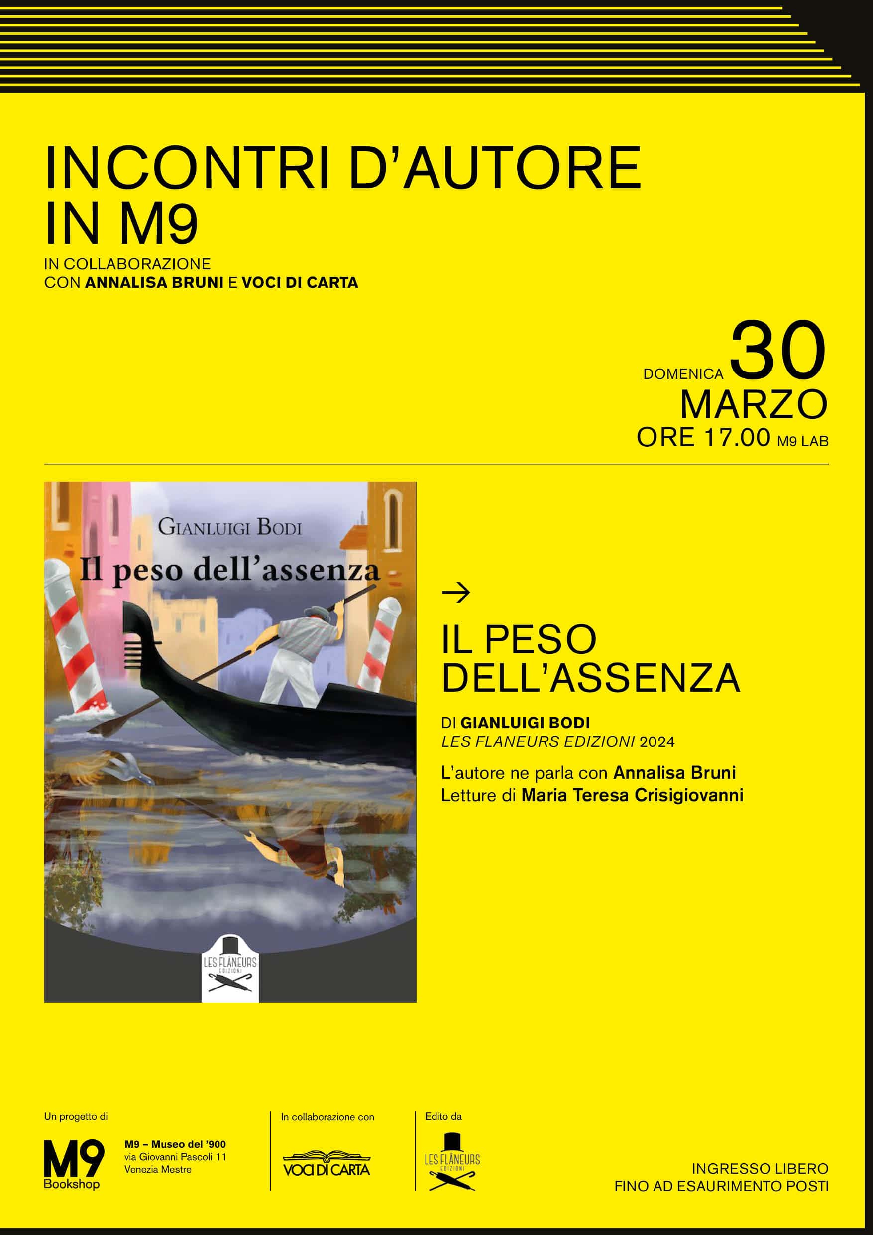 Gli Incontri d’autore in M9 – Museo del ‘900, Mestre, in collaborazione con la scrittrice Annalisa Bruni e l’associazione Voci di Carta, proseguono domenica 30 marzo 2025. Alle ore 17 sarà presentato nella sala M9Lab il romanzo Il peso dell’assenza di Gianluigi Bodi (Les Flaneurs edizioni, 2024).