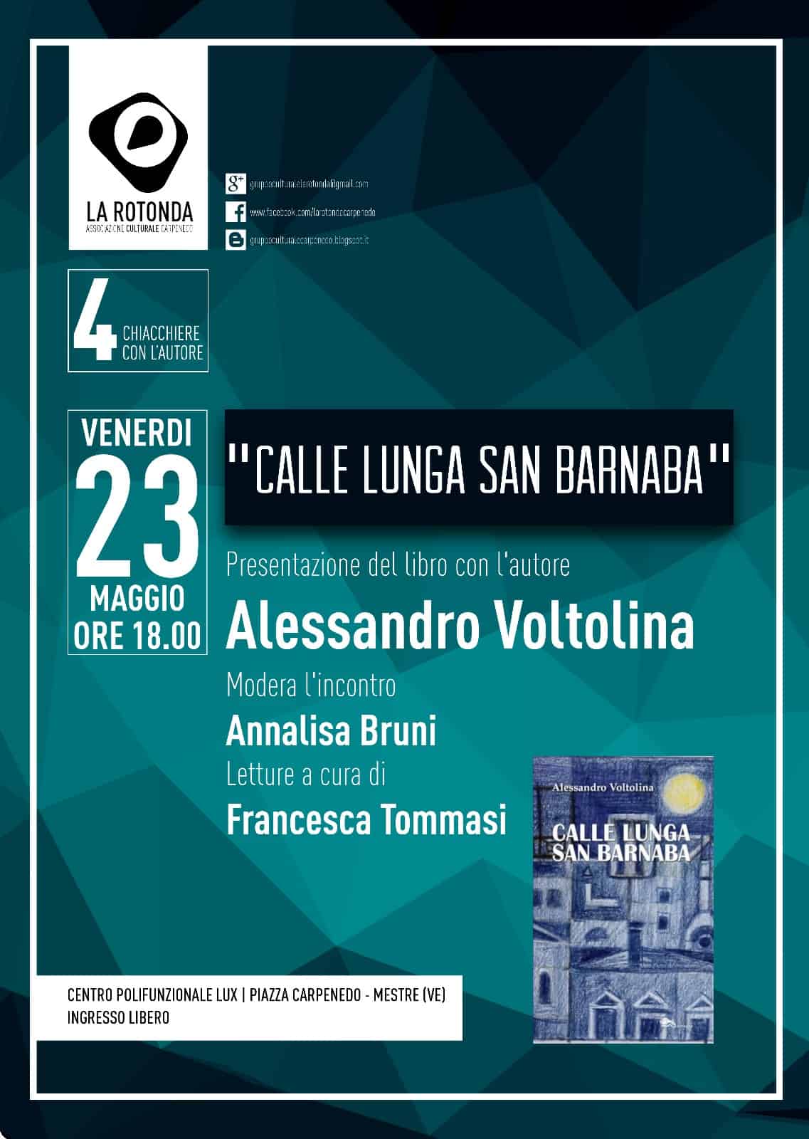 Il libro sarà presentato venerdì 23 maggio, alle ore 18, al Centro polifunzionale Lux, Piazza Carpenedo, Mestre. Dialogherà con l’autore Annalisa Bruni. Letture di Francesca Tommasi.