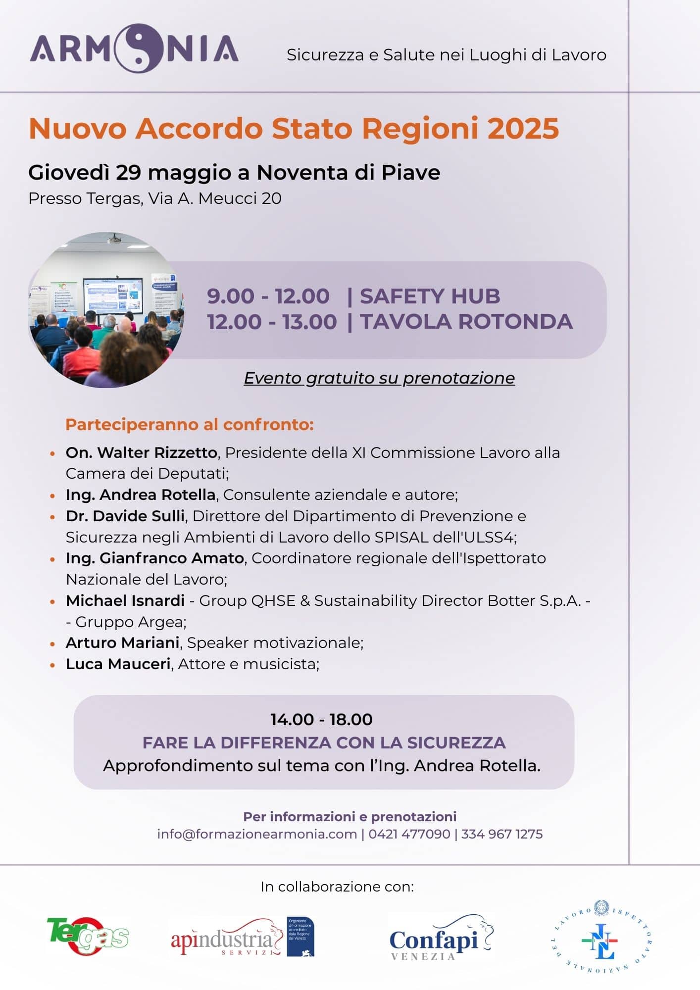 La Tavola Rotonda istituzionale è in programma giovedì 29 maggio, dalle ore 12 alle 13, presso l’aula formazione dell’azienda associata a Confapi San Donà, in Via A. Meucci 20, all’interno del seminario “SAFETY HUB: Connettere regole, persone e cultura”. L’incontro sarà un’occasione di confronto tra esperti, tecnici e rappresentanti del territorio sugli impatti, le opportunità e le criticità legate al nuovo Accordo Stato-Regioni. Saranno presenti figure del mondo produttivo, della formazione e della prevenzione, quali SPISAL e Vigilanza dell’Ispettorato Interregionale del Lavoro, oltre a professionisti della sicurezza e rappresentanti delle Forze dell’Ordine, nonché istituzioni, fra le quali il Presidente della
