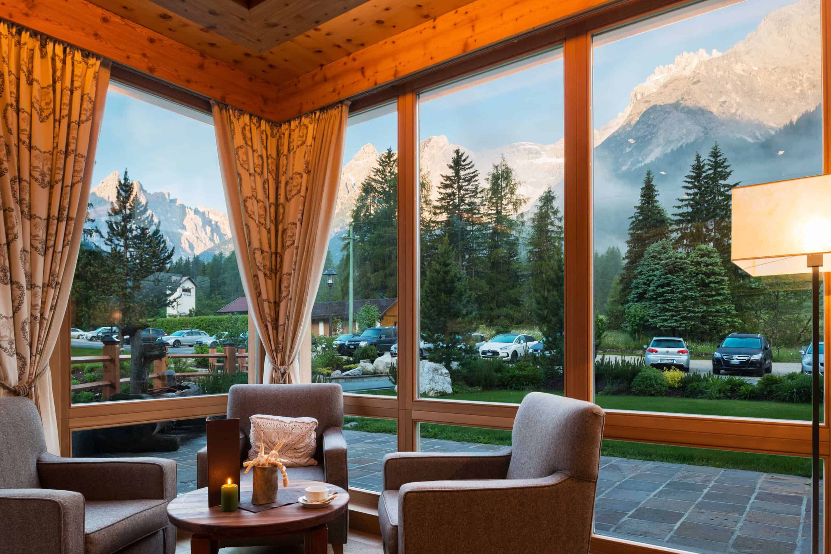 Ma anche chi rimane in hotel può godere del panorama unico di questo luogo. Dalla piscina esterna, ad esempio, circondata dal giardino curato e fiorito, coccolati dall’idromassaggio ci si gode la vista sulle vette. Come anche dagli spazi comuni interni, la sala ristorante e la Spa, ad esempio, grazie alle grandi vetrate che creano un tutt’uno con l’esterno. E poi direttamente dalla propria stanza, distesi sul letto o immersi nella schiuma della vasca o seduti sul balcone, il panorama sulle Dolomiti è sempre lì, a portata di vista, con riflessi di luce che variano nei diversi momenti della giornata, regalando uno spettacolo sempre unico.