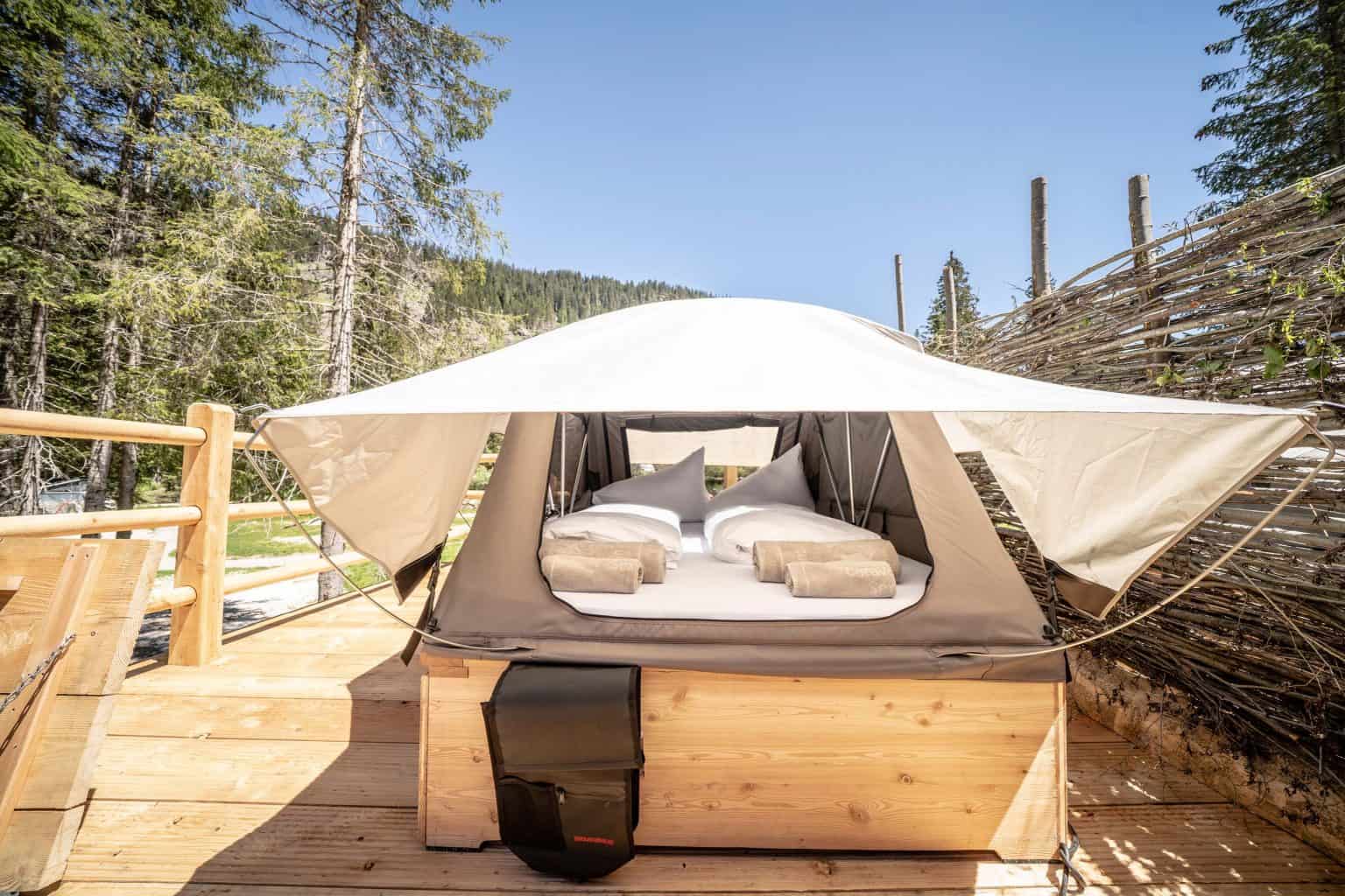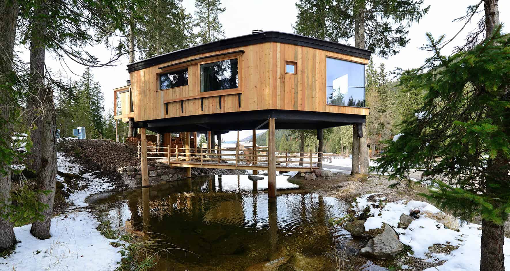 A 3,5 metri dal suolo, queste costruzioni in legno di larice locale, realizzate secondo i moderni concetti della bioarchitettura, sono un incantevole rifugio elegante con un soggiorno di 35 m². Sono dotate di televisore, di una elegante zona bagno con vasca idromassaggio indipendente e doccia sensoriale, di un camino, una sauna propria e un ampio letto con vista sul vicino ruscello. Dormire tra le fronde fa bene al fisico e all’anima ed è una tendenza in crescita. Anche una vacanza breve può aiutare a diminuire lo stress e ritrovare l’armonia interiore, soprattutto se la destinazione è il bosco.