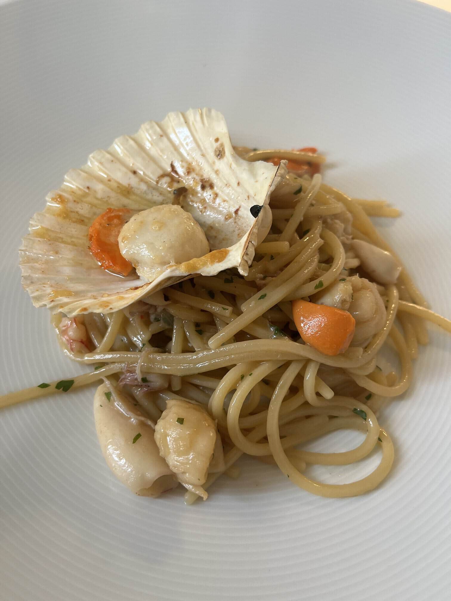 Ingredienti (per 4 persone). 8 mazzancolle sgusciate, 8 scampetti sgusciati, 100 g di calamaretti puliti, 8 capesante sgusciate e ben lavate, olio di oliva al limone qb, 1 spicchio d’aglio, 1 cucchiaio di prezzemolo tritato, zeste di mezzo limone, pepe nero appena macinato, 4 foglie di basilico, 320 g di spaghetti.